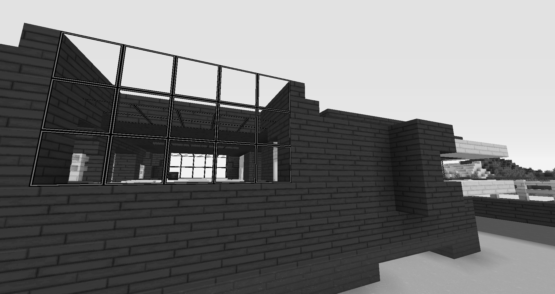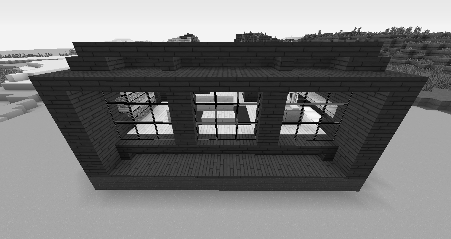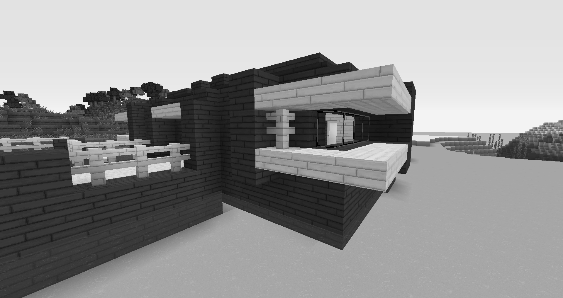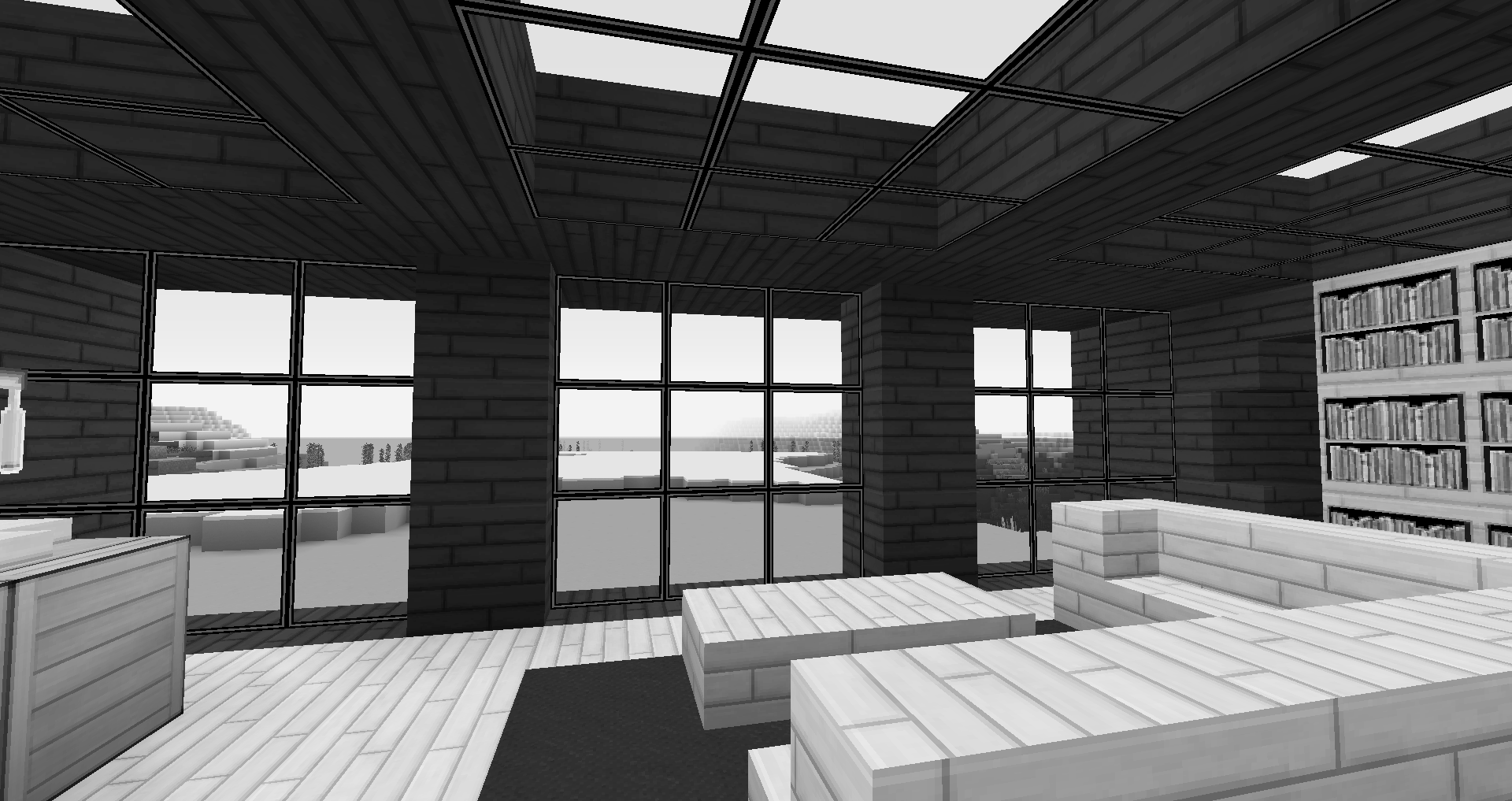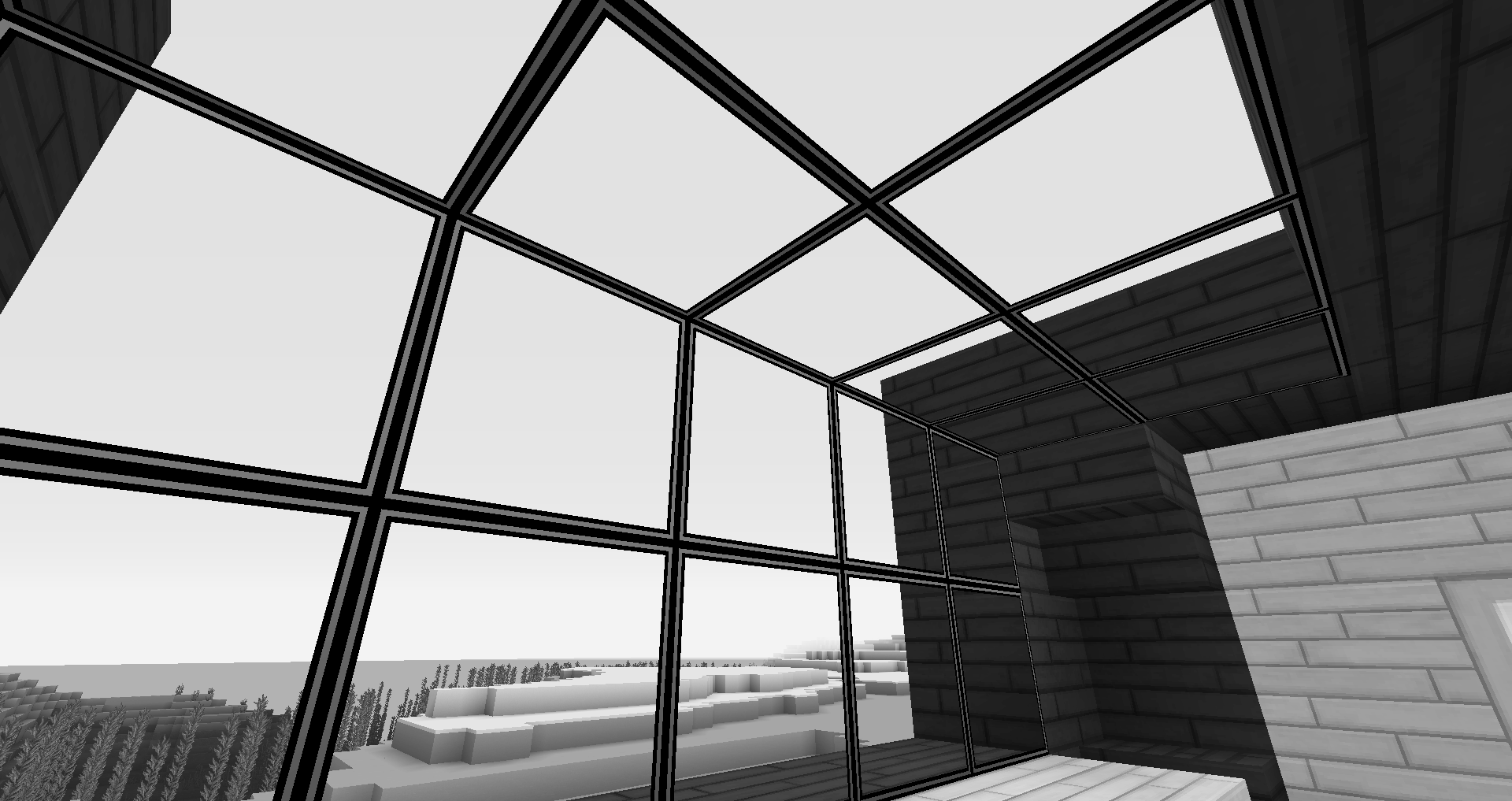 The room with the three big glasses was meant to be the master bedroom but it turned out otherwise. Now it is the living room. The two main bedrooms are located at the entrance of the building because you will have "the most" privacy there. What is also special about this little idea is the "complex" roof with the glass in it. It is such a shame that there are no half-glass-blocks in the normal version of MINECRAFT.