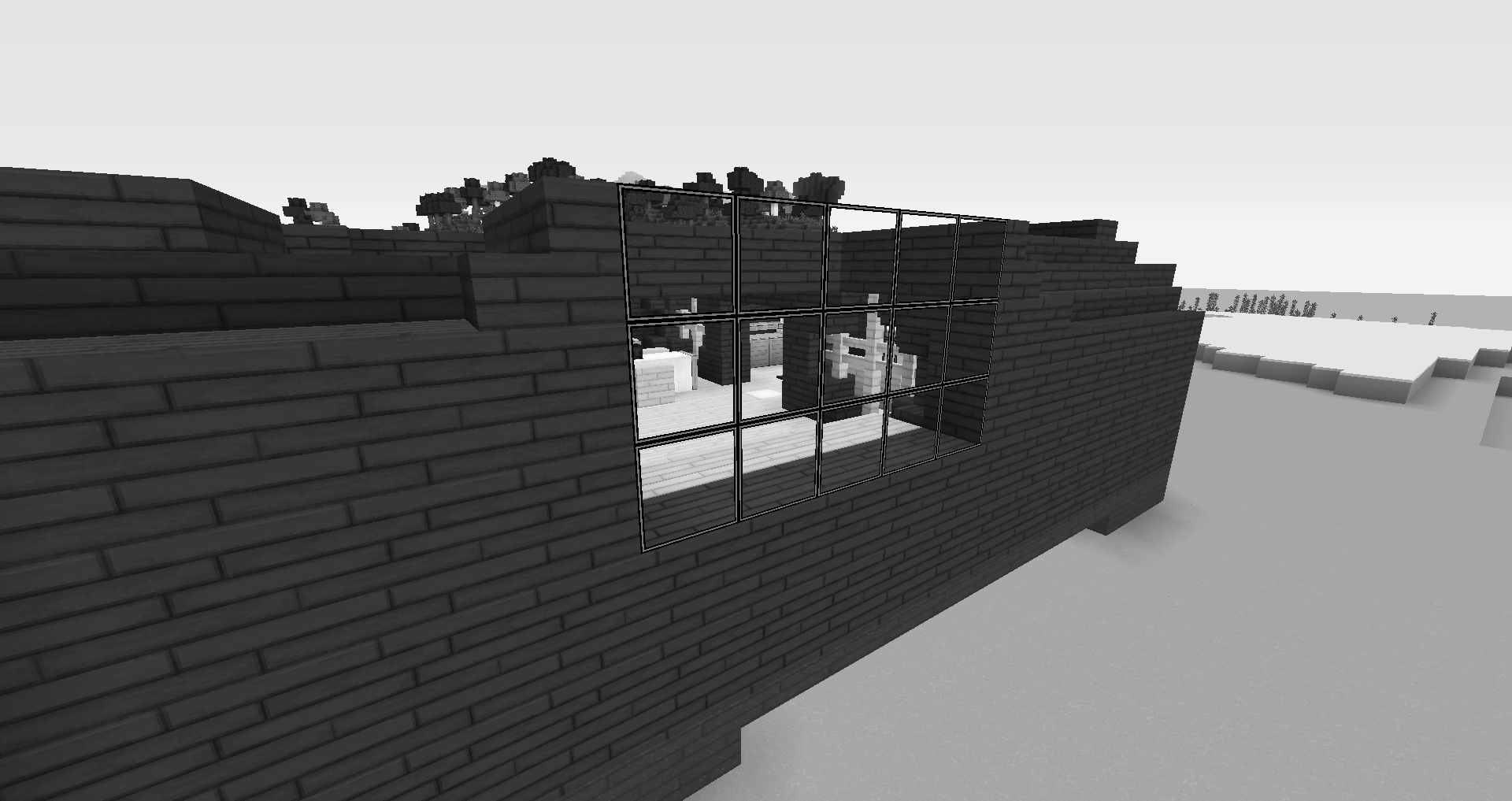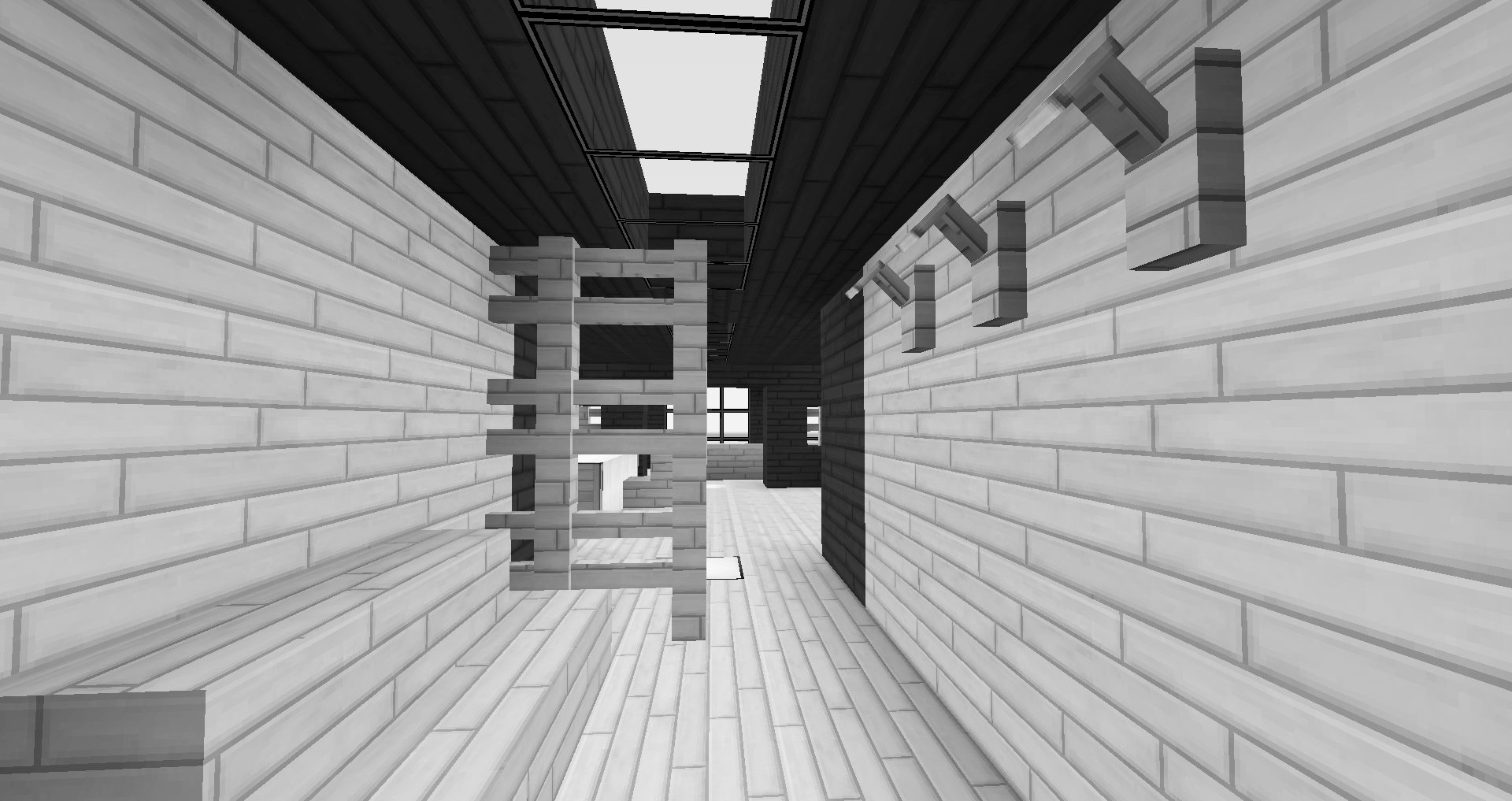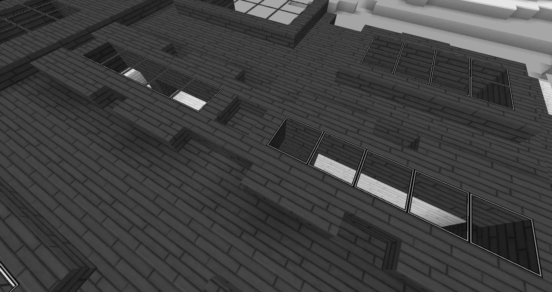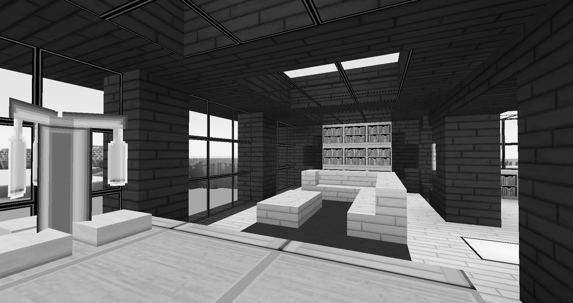 The room with the three big glasses was meant to be the master bedroom but it turned out otherwise. Now it is the living room. The two main bedrooms are located at the entrance of the building because you will have "the most" privacy there. What is also special about this little idea is the "complex" roof with the glass in it. It is such a shame that there are no half-glass-blocks in the normal version of MINECRAFT.