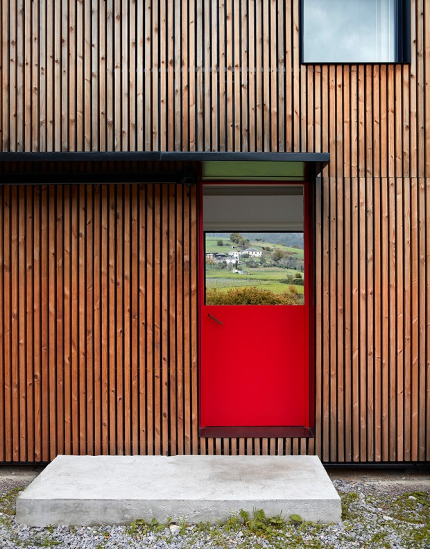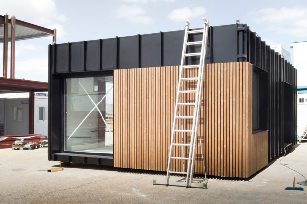 The final two-storey structure is composed of eight modules of 2.15 to 5.30 meters, stacked four by four. The four basic modules are cubic, while the four above are sloped so that once assembled, they form an asymmetric gable roof. The kernels of the modules consist of galvanized steel sheets coated with thin vertical strips of wood.