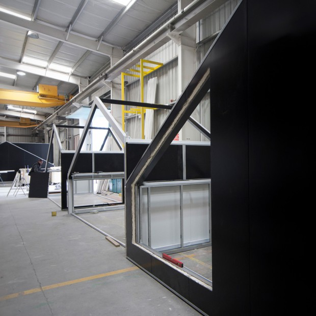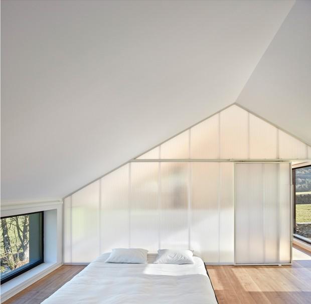 Upstairs, two bedrooms are separated by a translucent polycarbonate wall that allows light windows to invade the two rooms. Most of the construction was done off-site, while reduced turnaround time kept costs down. Durable materials have been used in construction and the house is designed to be energy efficient. If the owners wish, the house can be dismantled and moved to a new location.