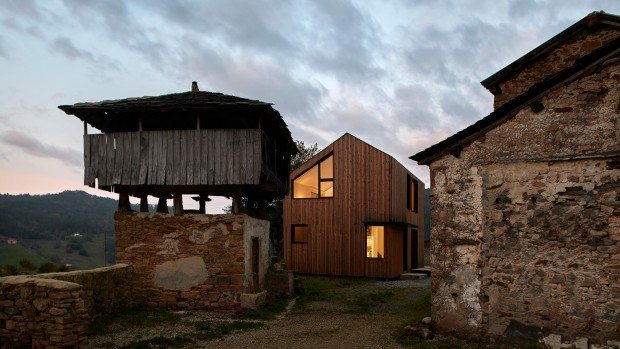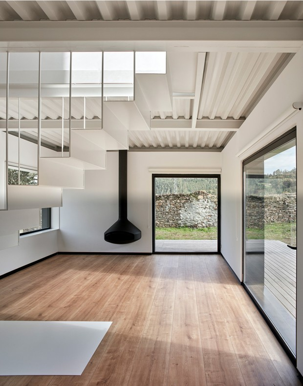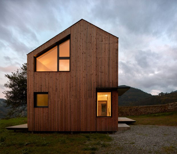 The modules took four months to be manufactured in a factory in Madrid, before being shipped more than 900 km on the Cantabrian mountain range on the site of a former stone granite complex. The house is modern in its construction, but the finish integrates aesthetically with its rural environment.