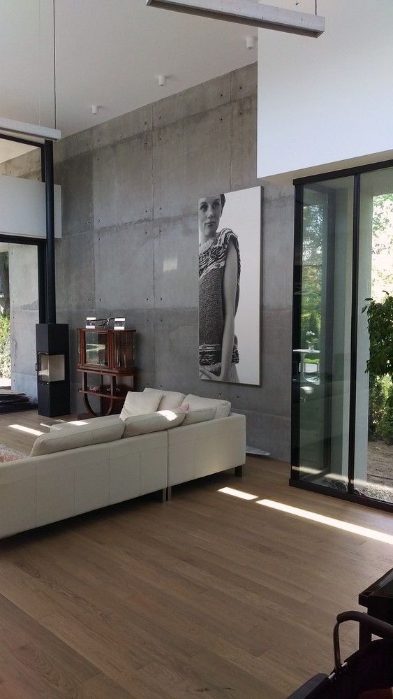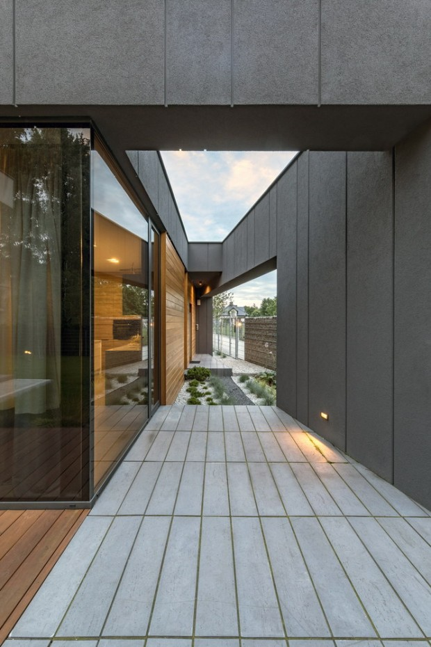 The studio built this detached house in the city of Czarnów, Poland. The owners wanted a house open to the outside, while preserving their privacy. The architects made two blocks, one block facing south, which is dark and closed, and one block facing north, higher with lighter shades of gray. The openings are at the junction of these two modules.