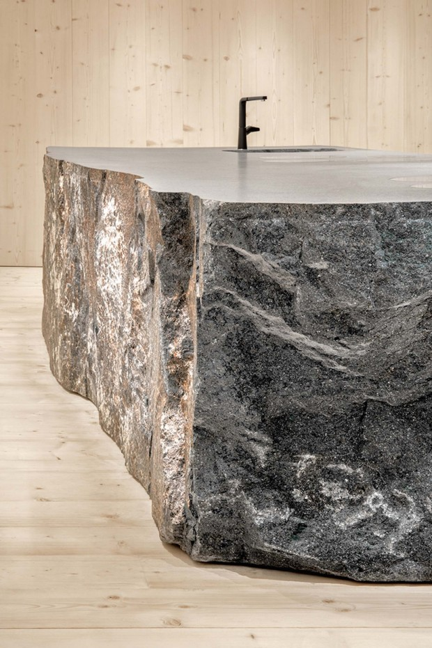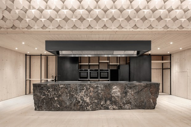 The hotel is famous for its restaurant, the owners wanted to extend the experience by giving cooking classes in this wonderful setting. The site is built around an immense central island composed of no less than 22 tons of local natural stone. To highlight this centerpiece, the rest of the space is treated in a sober, minimalist and chic way.