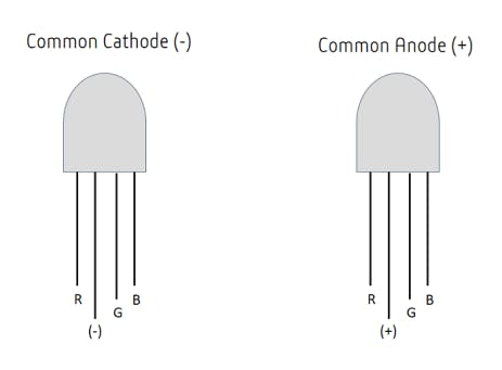 ►RGB LEDs have 4 pins which can be distinguished by their length. The longest one is the ground (-) or voltage (+) depending if it is a common cathode or common anode LED, respectively.