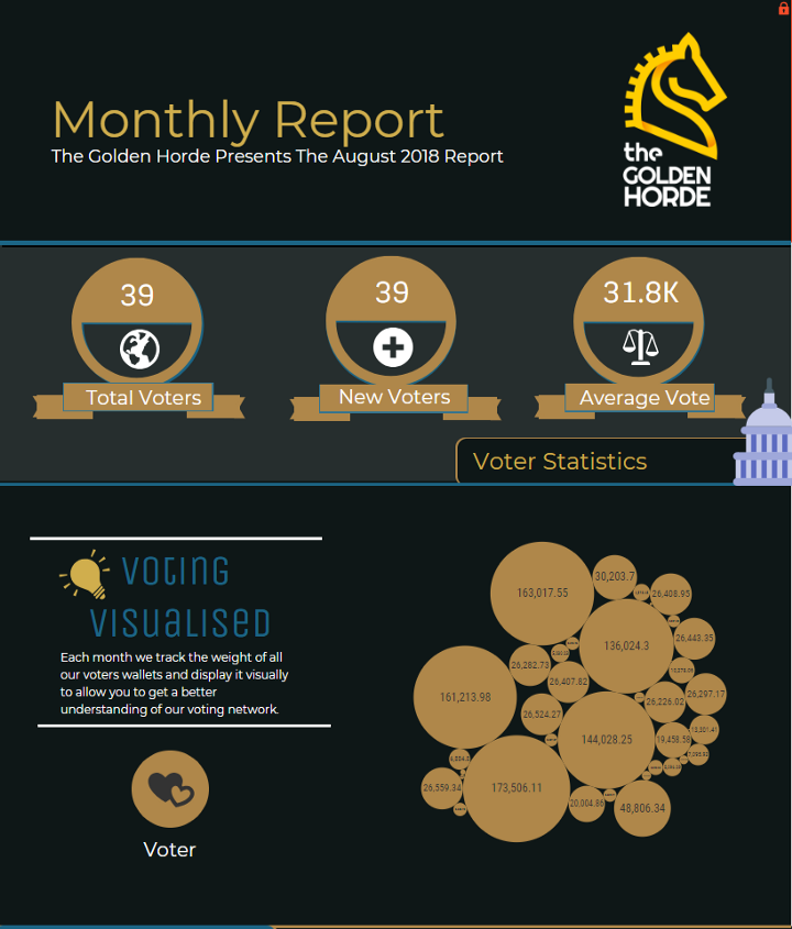 As many may know, August was our first full month of forging since getting into the top 51 delegates back in late July. Since then we’ve been busy creating, tinkering and updating things that we believe will be interesting for our voters and the community. These monthly updates aim to be a comprehensive filler on what we’ve spent our time on during the past month, as well as what we’re preparing for the near future. We’re ensuring that each of our voters and the community alike can stay up to date with The Golden Horde’s progress so these articles will be full of statistics, breakdowns and any trivia we may have to share!