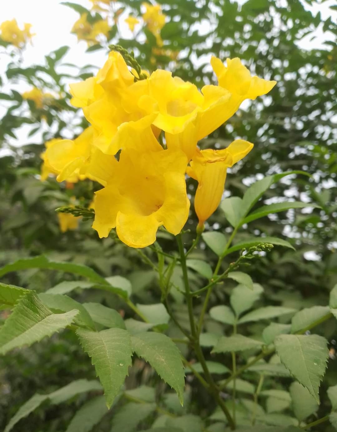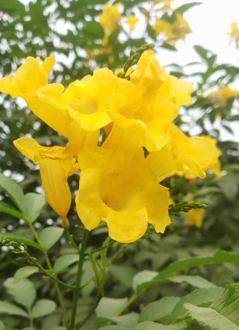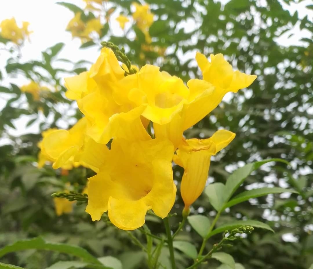 Խոշոր, ցուցադրական, ոսկեգույն դեղին, շեփորաձև ծաղիկները ողկույզ են՝ ճյուղերի ծայրերում: Ծաղկի պսակը զանգակաձևից ձագարաձև է, հինգ բլթակ (թույլ երկշրթունքներով), կոկորդում հաճախ կարմրավուն երակներով և 3,5-ից 8,5 սմ երկարությամբ: Ծաղկումը տեղի է ունենում գարնանից աշուն, բայց ավելի առատորեն՝ գարնանից ամառ։ Պտուղները՝ նեղ պարկուճները, առաջանում են երկու կարպելներից և ունեն մինչև 25 սմ երկարություն։