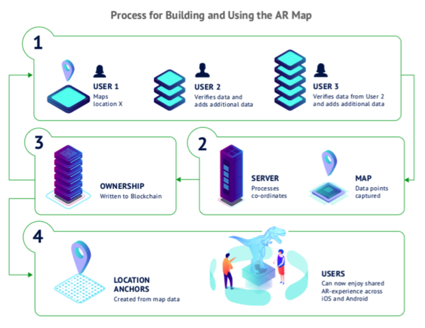 3. AR Map. Virtual 3D-map of trading halls, cities, and other objects, containing information about goods and services, advertising banners. Users scan a territory using a camera on a smartphone, data uploads to the cloud storage and link to a real location based on the GPS data. The technology is similar to Google Maps or 2GIS, information about favorite stores and brands is additionally registered. The AR Map is decentralized, so the data is updated faster, each user can create a map or a virtual object on it.