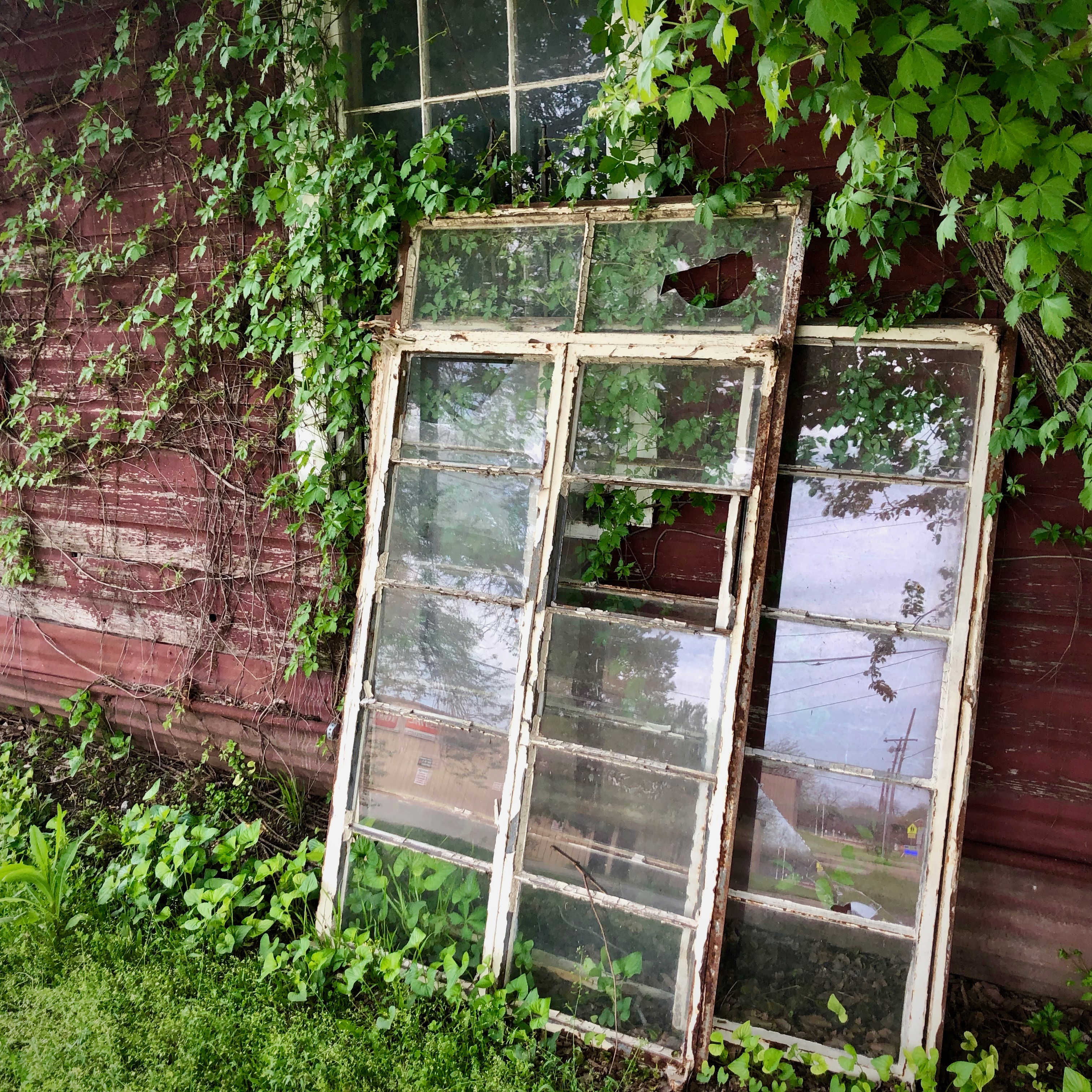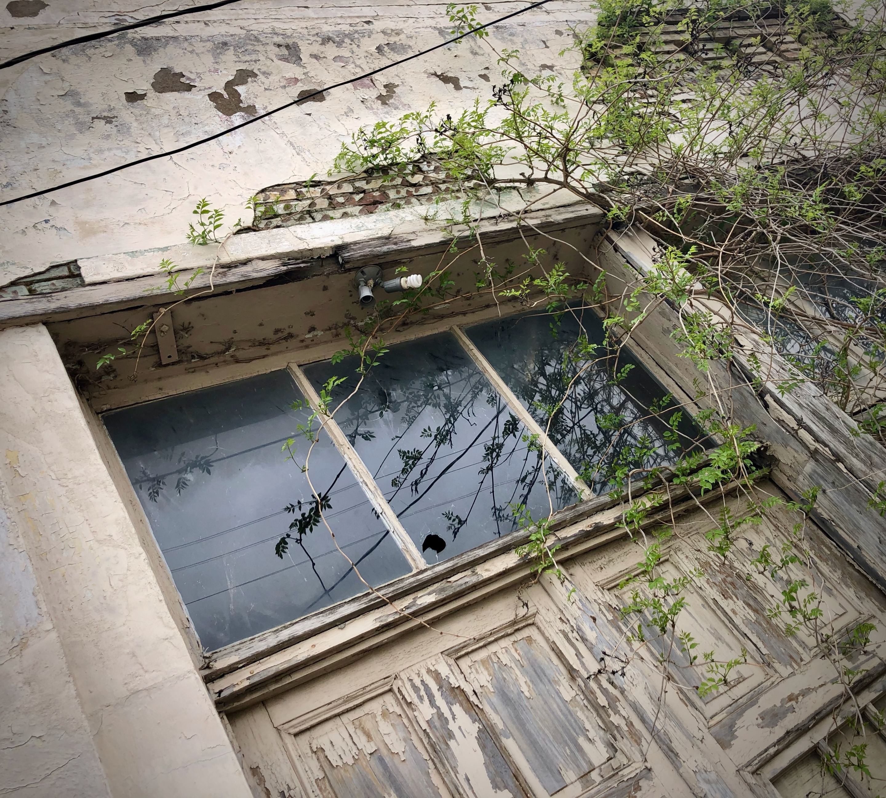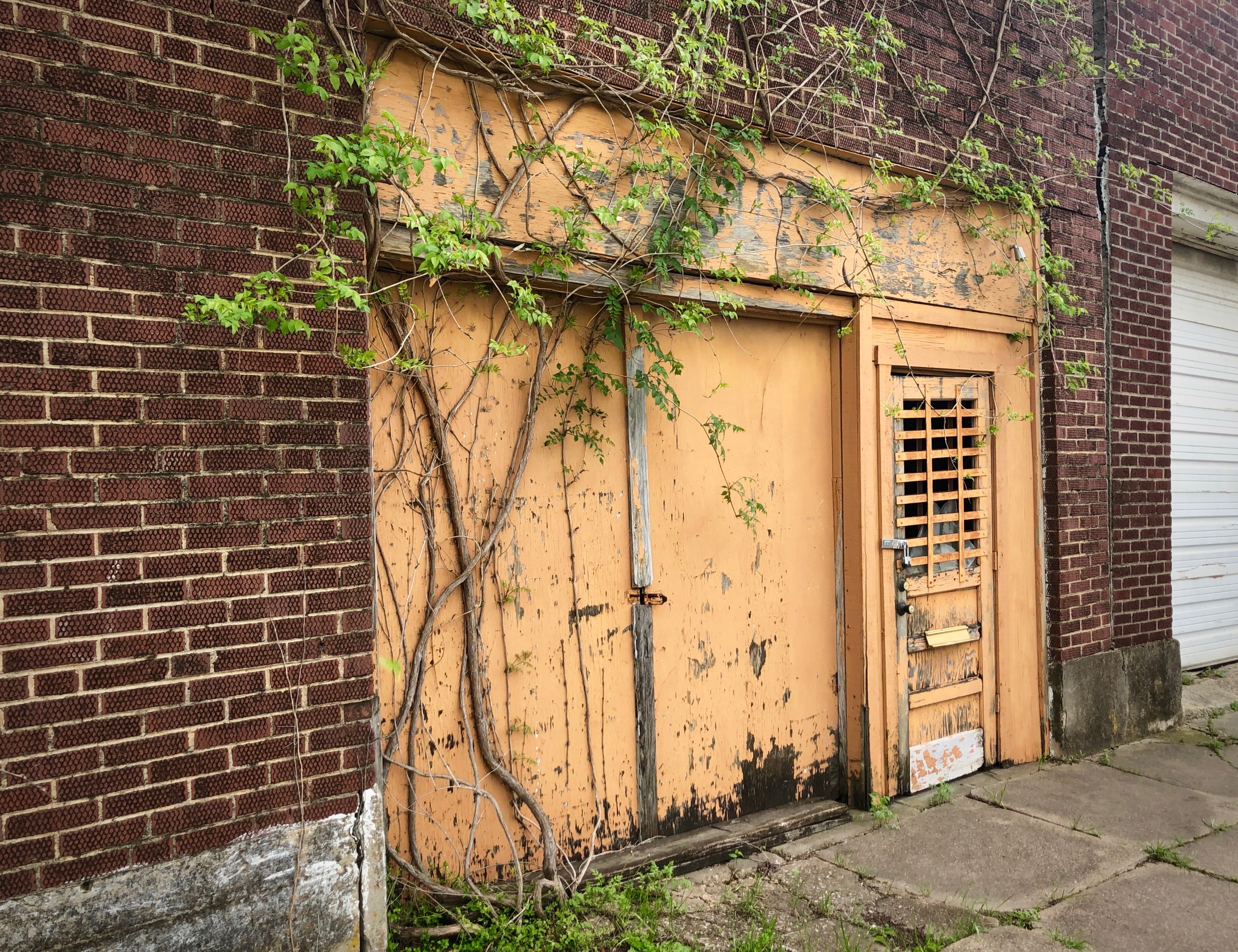 I rode to the familiar rhythm of rubber wheels on sidewalk cracks, until I came to the intersection of Virginia St. and Highway 5 in downtown McKinney, Texas. At the bottom of the landing some accumulated sand halted me in my tracks and I picked up my skateboard. I took a look around, hunting for more photo-worthy prey. Walking back towards the old railway, my attention was drawn to a row of old buildings, especially the leftmost unit — all brick with an entrance of wood painted orange, faded and flaking. Bright vines explored the strengths and weaknesses of the brick. Surveying up closer, I saw the glass behind wooden bars shattered in large slices.