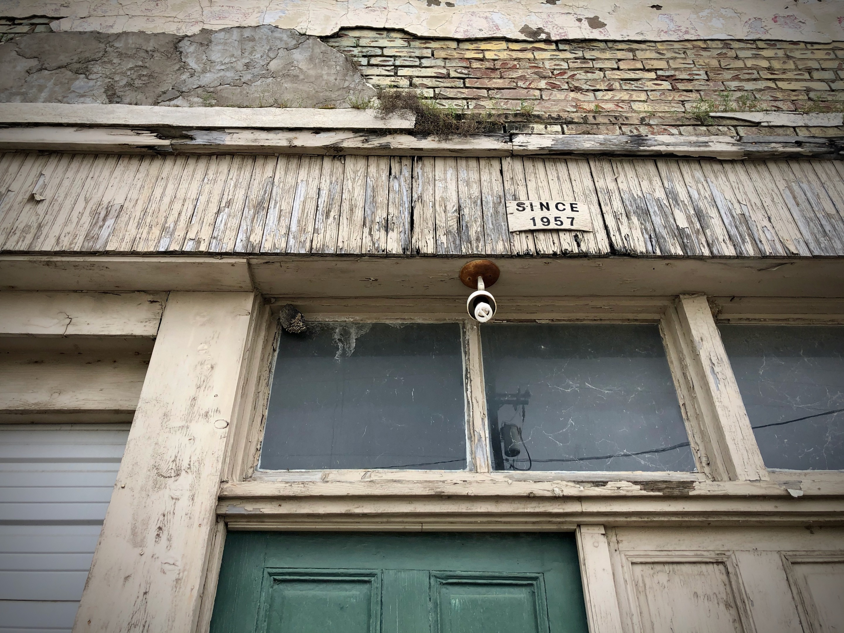 I was up close taking pictures of the broken panes when a voice called out "Hey man, you should open up a skate shop!" Surprised, I turned and beheld a man of average height with sun-browned skin who had paused in the street to address me. I laughed and said something about my fondness for old buildings. We spoke loudly, across the street from each other, while cars occasionally interloped. His companion remained silent and watched us as we spoke. I put my phone away and walked over.