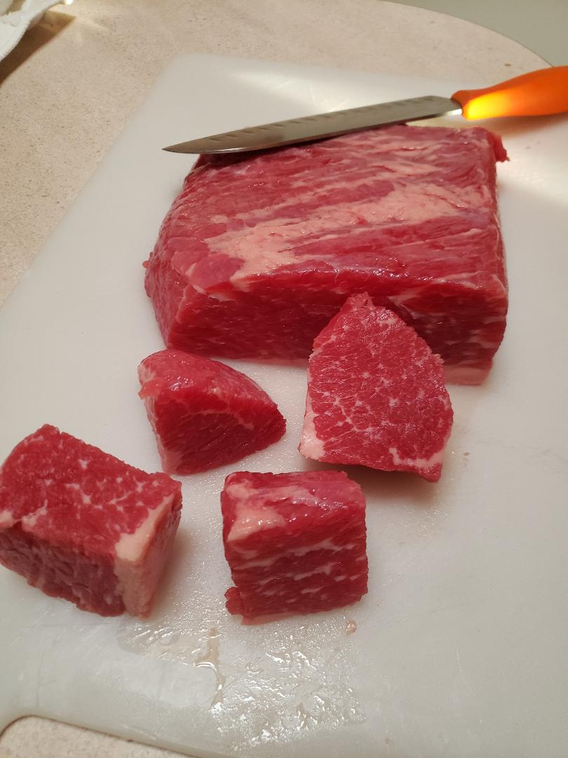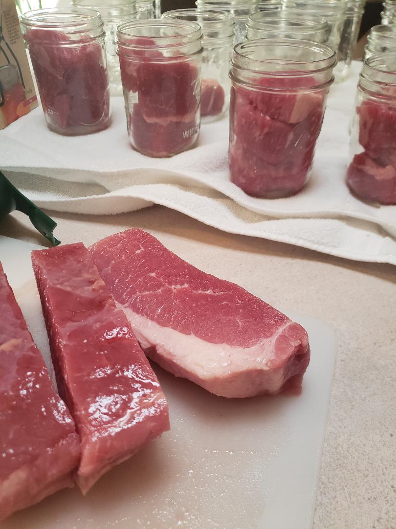 I chopped up, in big chunks the pieces of meat, placed them in clean and sterilized pint-sized jars, took all the safety precautions (wiped the jars with vinegar to remove any meat juices and placed them in my pressure canner.