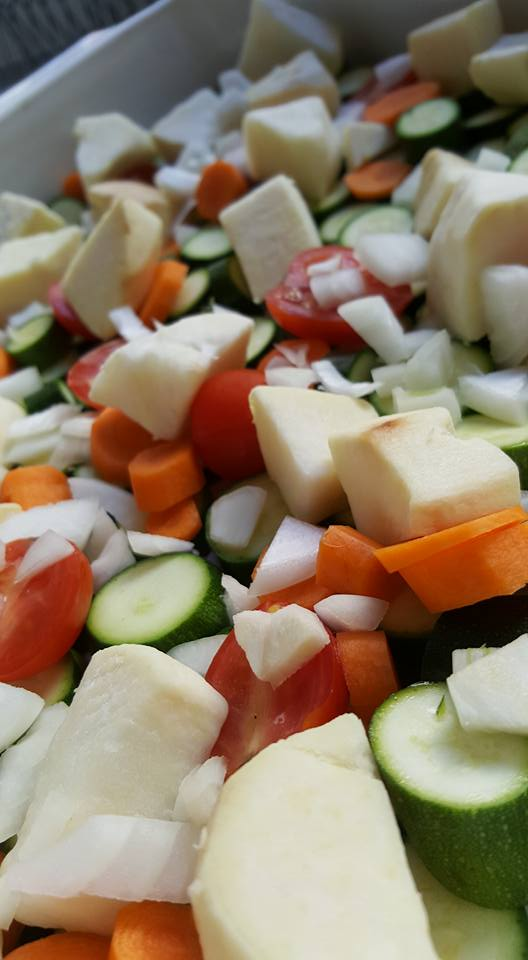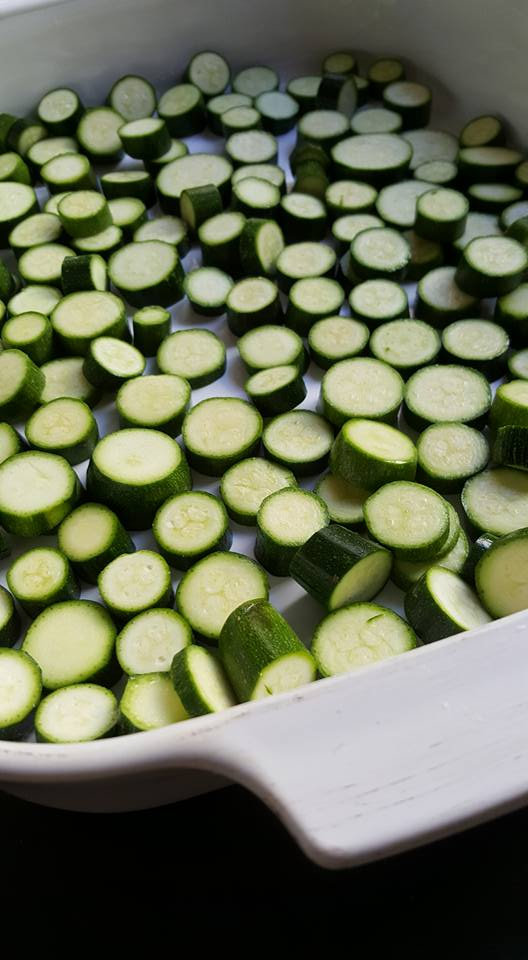 So I grabbed a rectangular baking dish, and put the first layer of veg in, which was diced baby marrows...