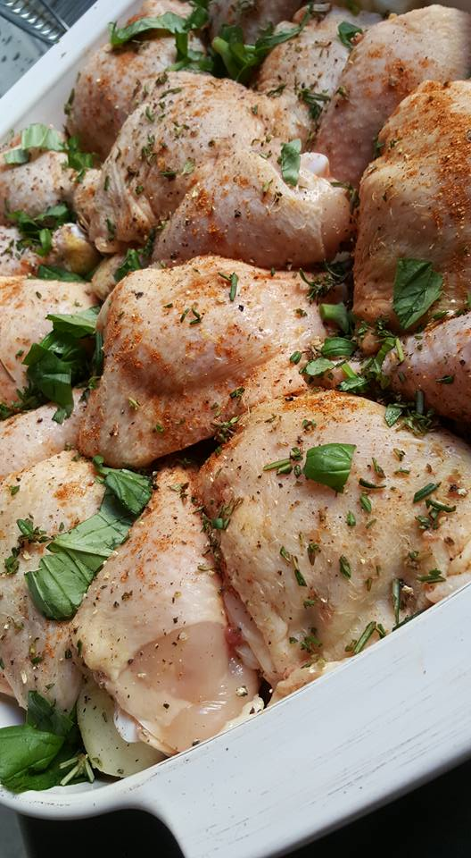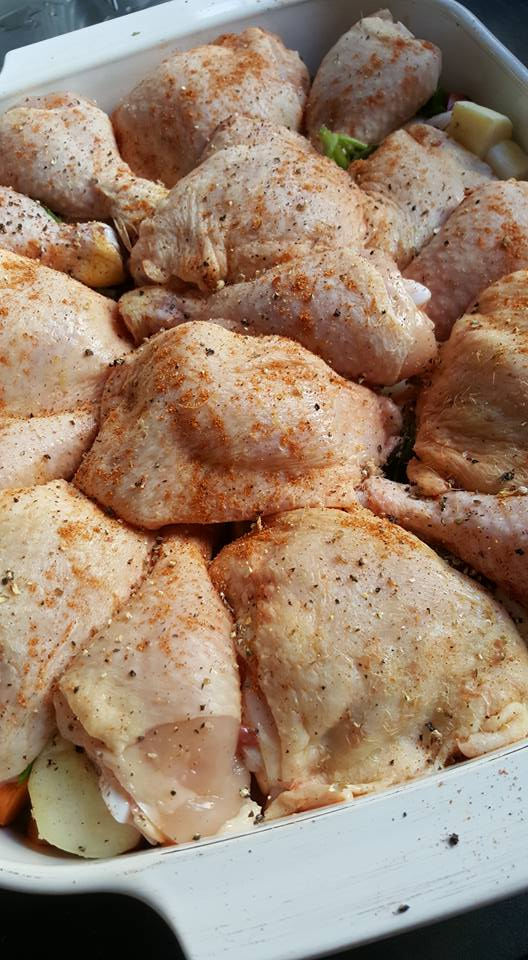 Then I placed the chicken on top of the veg and lightly spiced it. My best pieces are the drumsticks and thighs so that is normally my "go to"