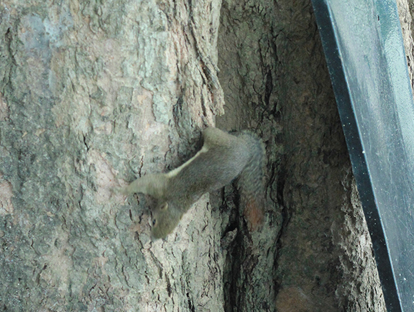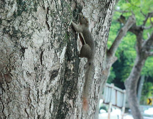At first he was on the tree, but suddenly he ran down and stopped halfway, and before we can get a good shot of him, he quickly ran up again. Too bad I don't have anything to lure him long enough to take some closed up.