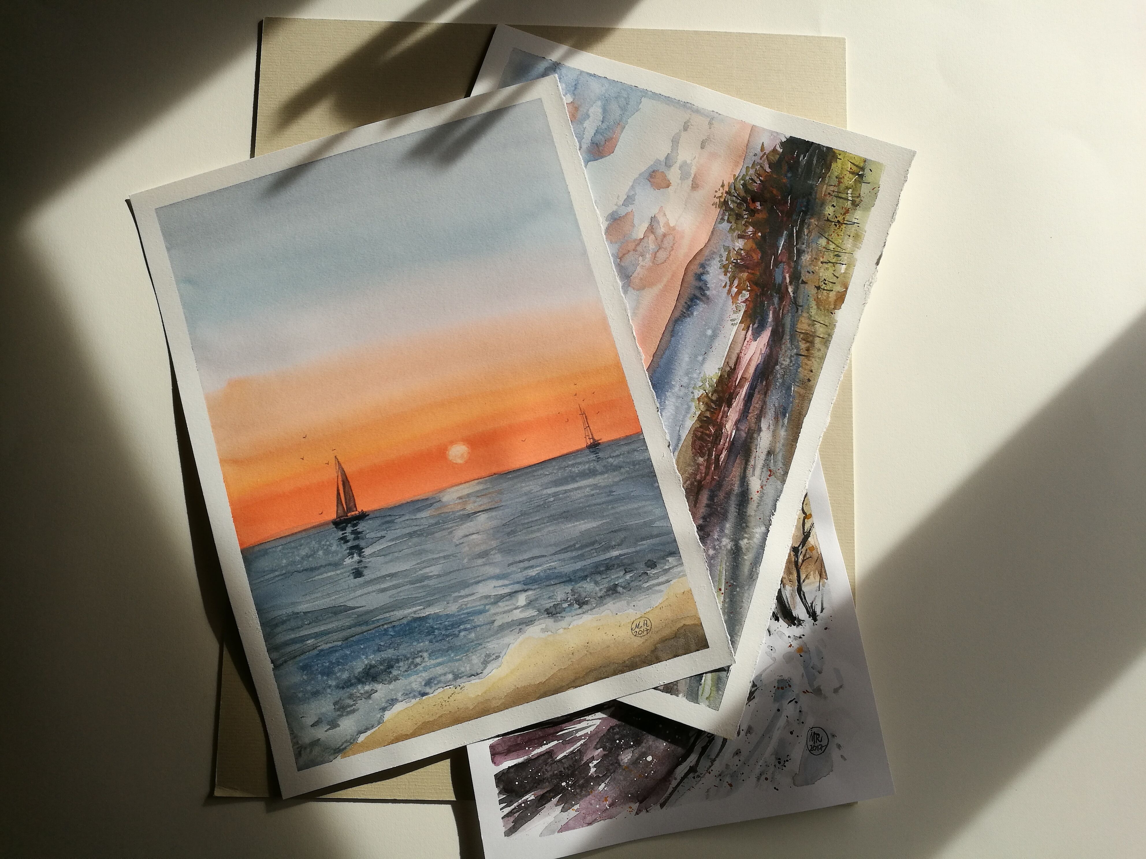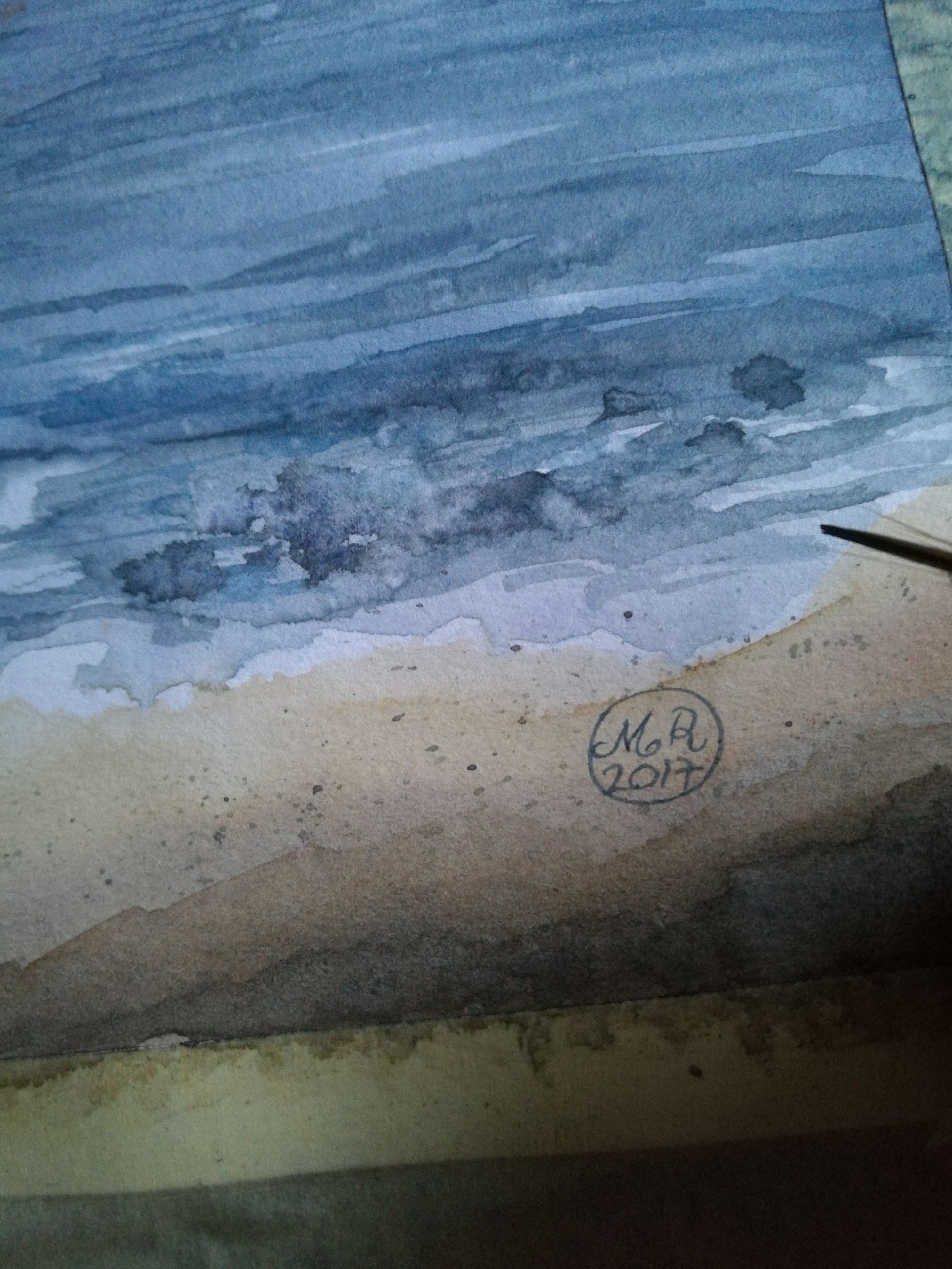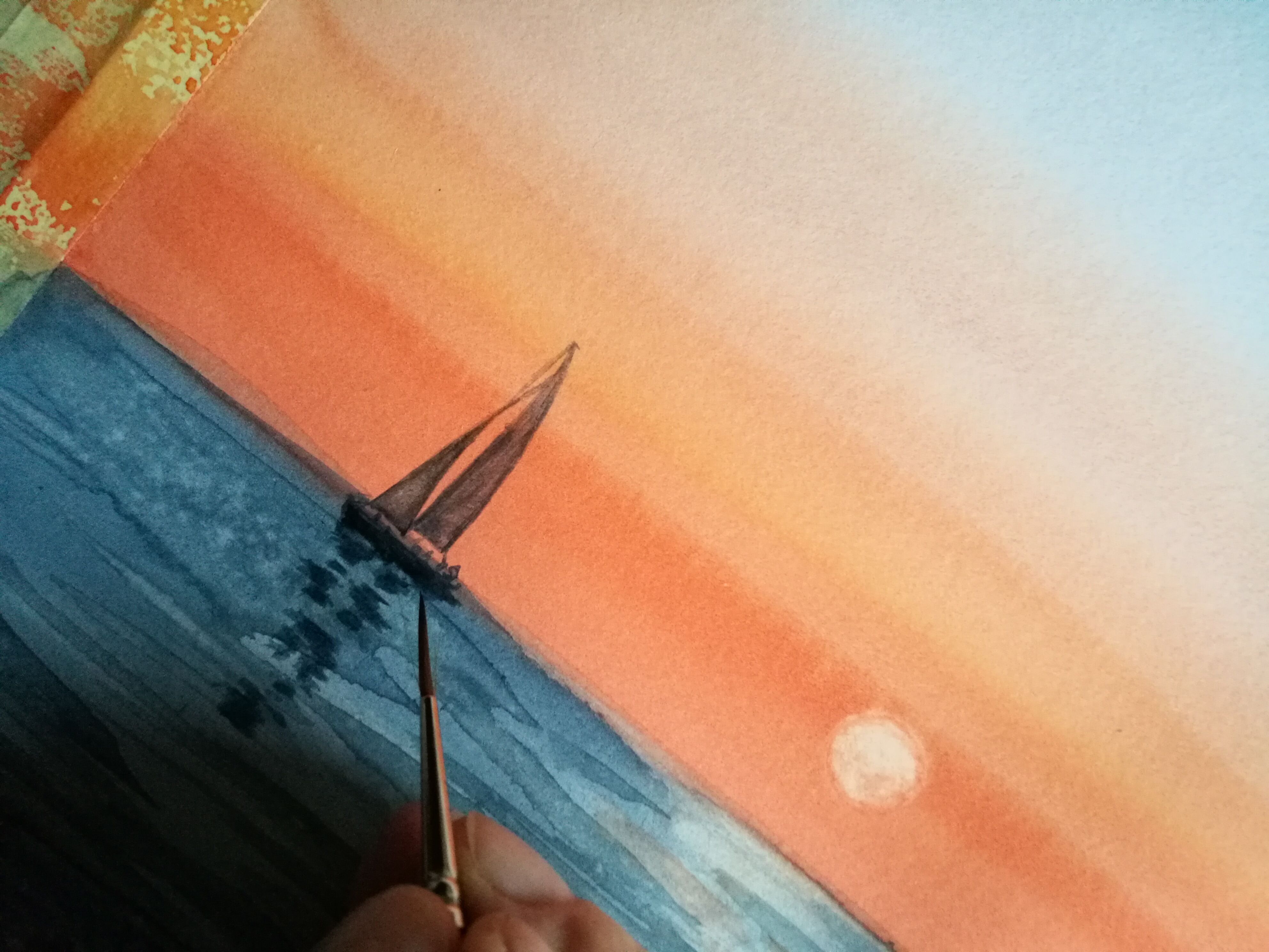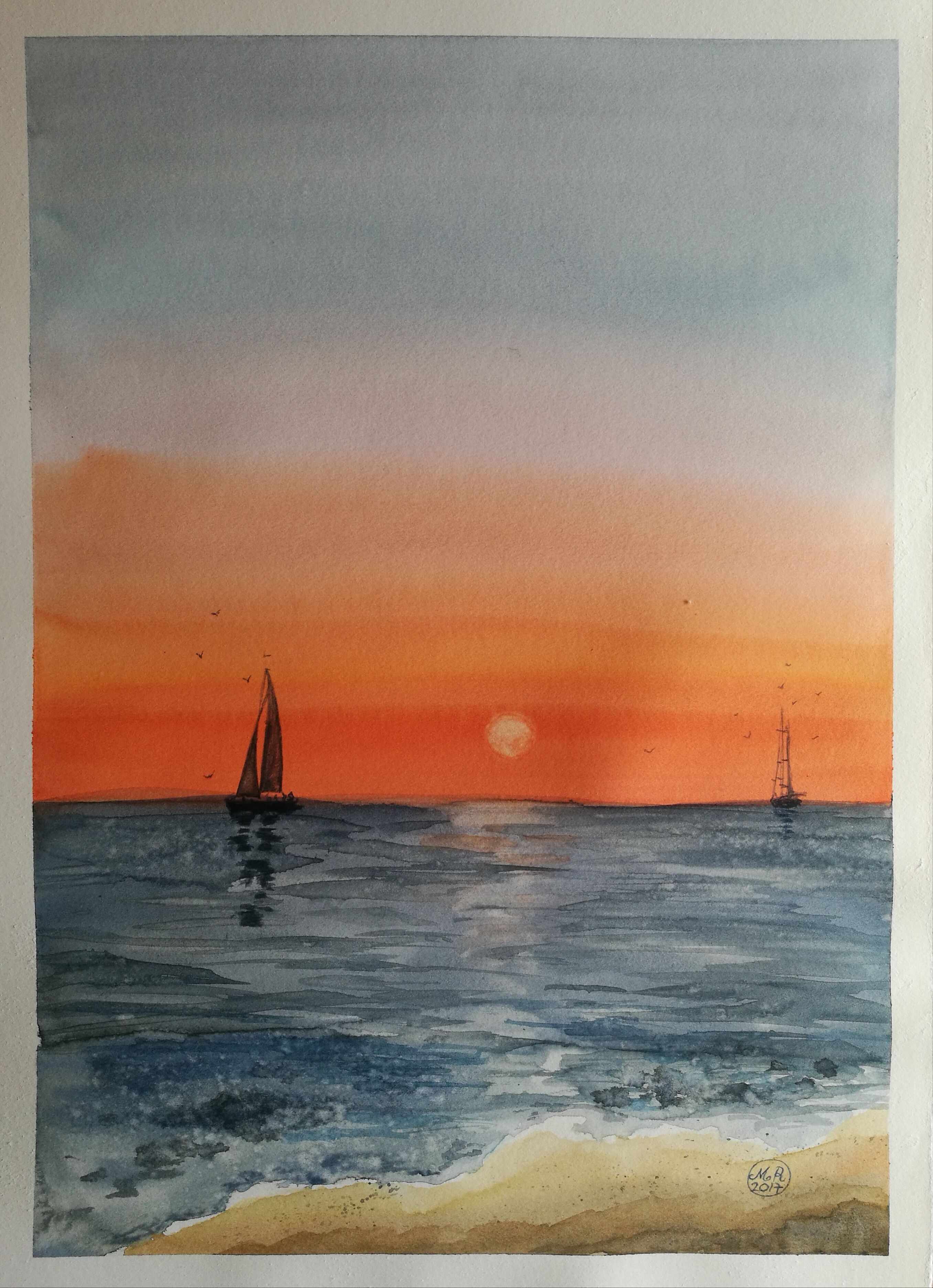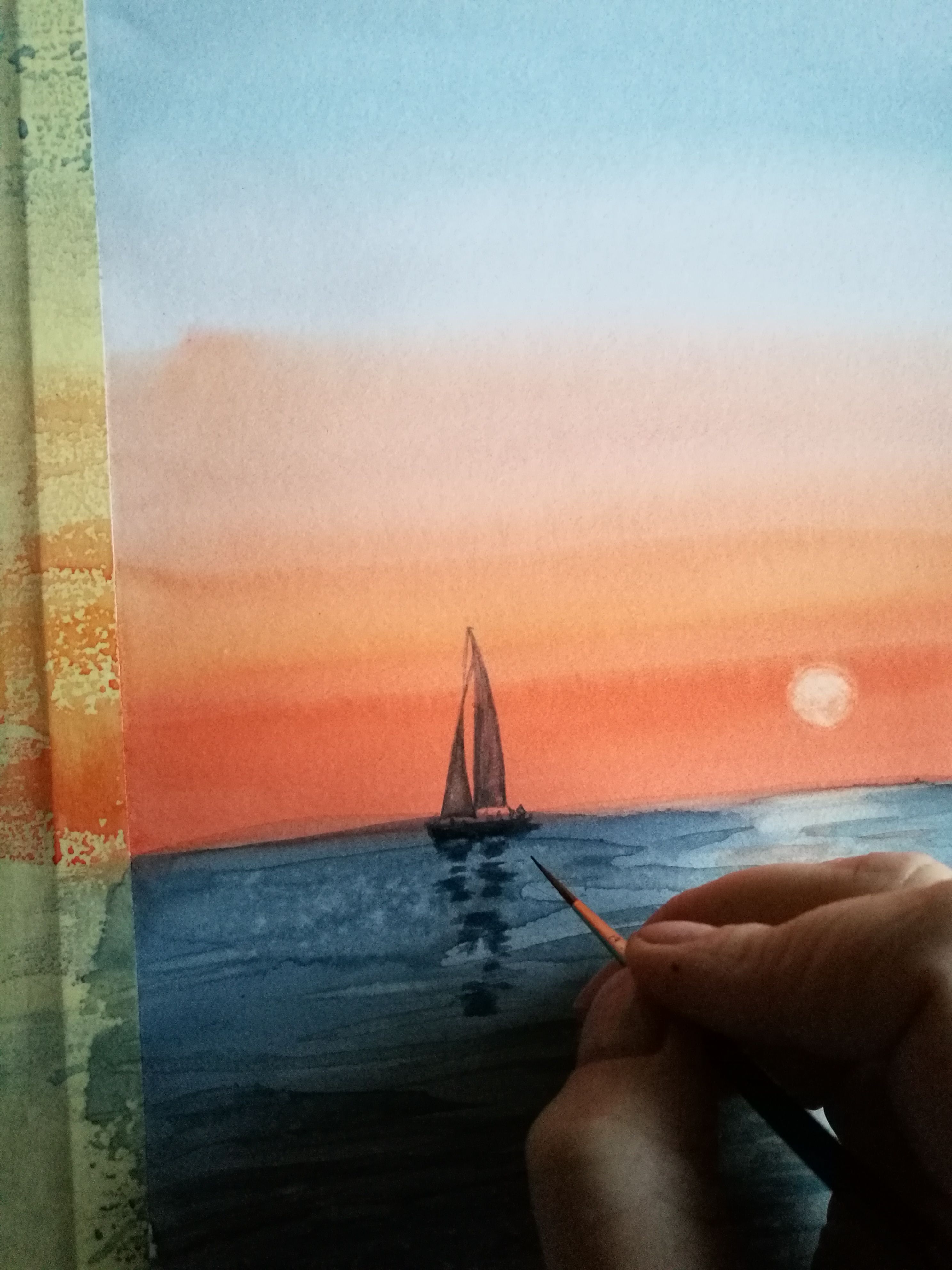 This drawing began as an exercise for the transition between colors, and ended up being a sunset. I kept the watercolor paper in a vertical position and I mixed the colors using the wet brush on the dry paper. What you see is the result, I mean the sky part of the watercolour painting.