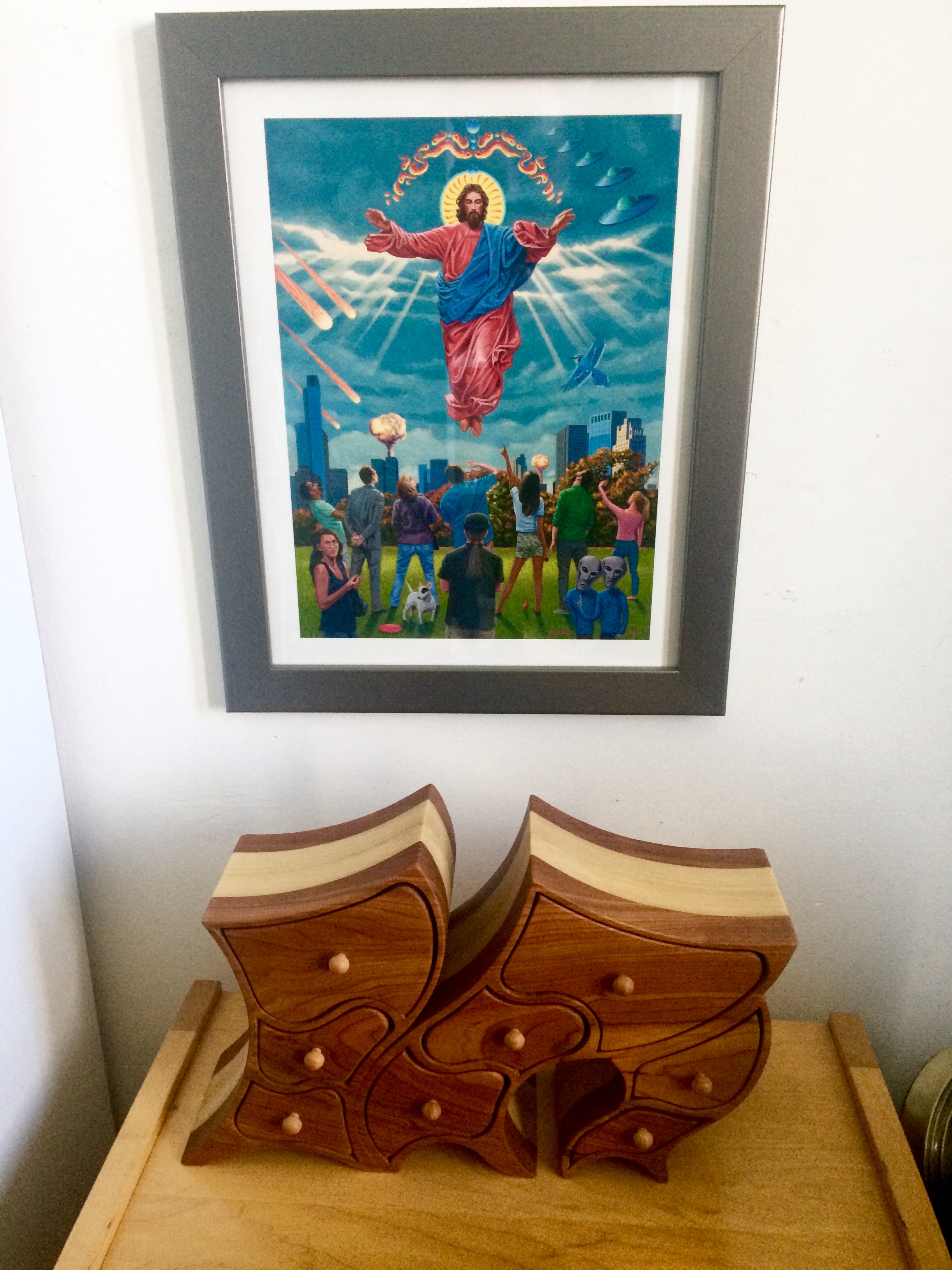 I found a perfect spot for it just above one of the wonderfully whimsical wood creations in my collection, made by André Dorais. You can see some of his work @ https://www.instagram.com/doraisartdesignad/