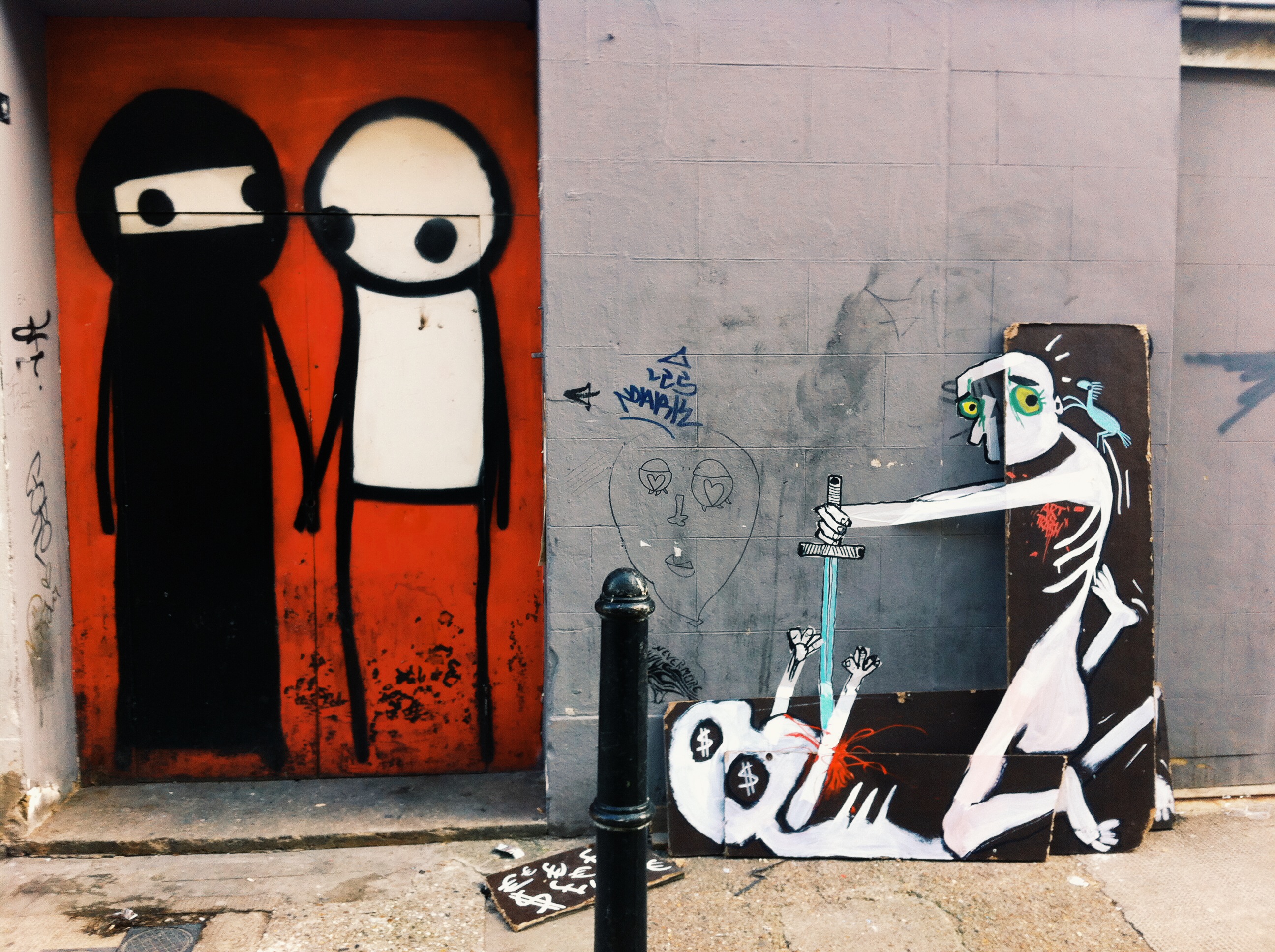 Years ago, I believe it was 2013, I came across this piece on the streets of East London. It was a combination of spray-painted art on a boarded up door, ink on wall, graffiti, cardboard painted art and stickers. It was the craziest combination I'd ever seen on the streets.