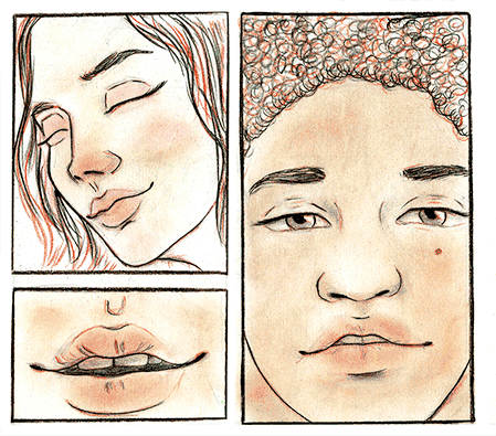 En ésta imagen sin texto, la ilustración es narrativa en lo siguiente: cuando vemos los tres cuadros podemos determinar un punto en común, los labios. Aunque son dos personajes diferentes, vemos que en el segundo cuadro hago un enfoque de los labios del personaje del tercer cuadro, que parece estar a punto de hablar, y por su gesto deducimos que es algo doloroso. También sabemos que cuando amamos a alguien de forma romántica nuestra mirada se centra en los labios de la persona que nos gusta.