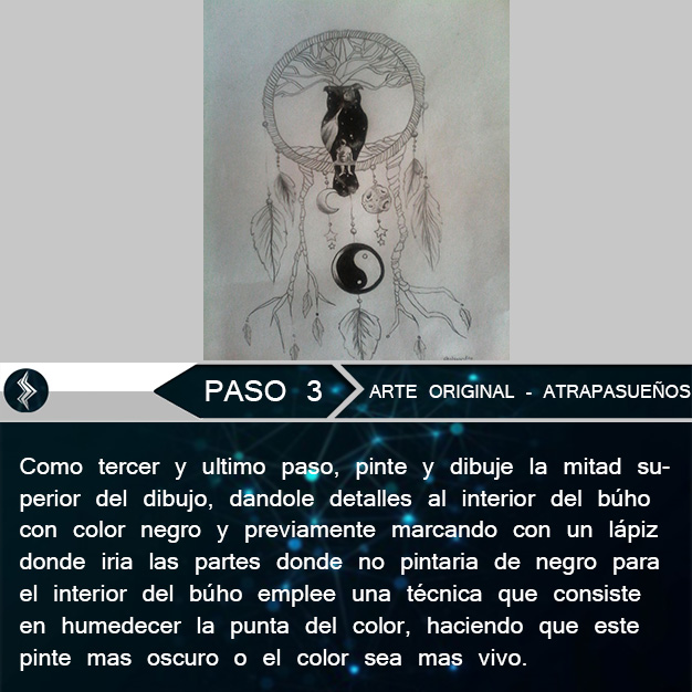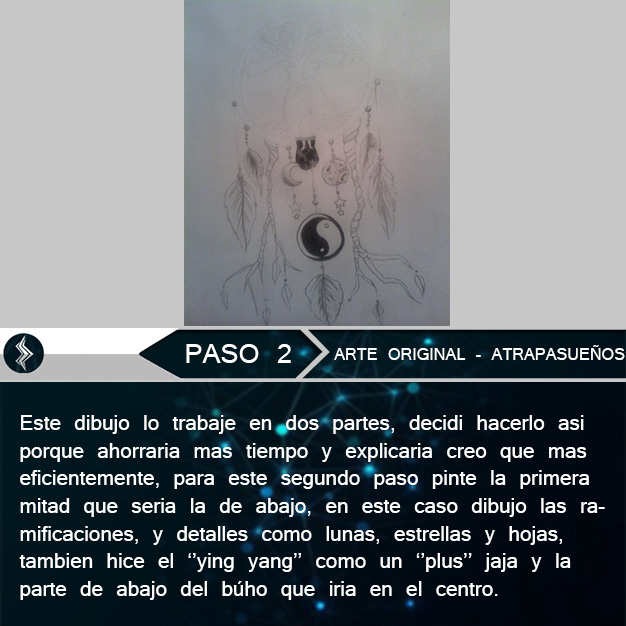 Hola amigos de steemit espero que estén muy pero muy bien! jaja y el dia de hoy les vengo a mostrar mi ultimo dibujo original, y se trata de un atrapa sueños que tiene ramificaciones que se extienden hacia abajo y de ellas cuelgan lunas y estrellas, en medio de el aro esta la silueta de un búho y quise añadirle un ''extra'' asi que dibuje un hombre pequeñito sentado mirando a la luna bajo un cielo estrellado y esta fue la explicación de lo que hice pero...¿Que es un atrapa sueños?, en breve una breve descripción y seguidamente los pasos del dibujo jaja.