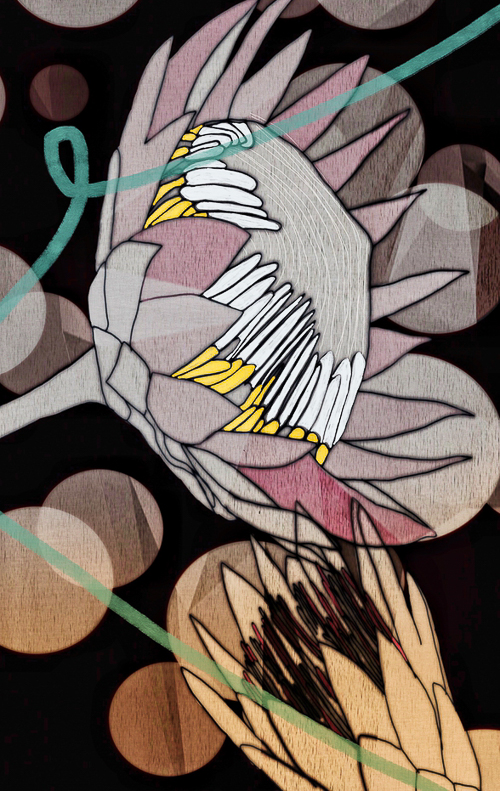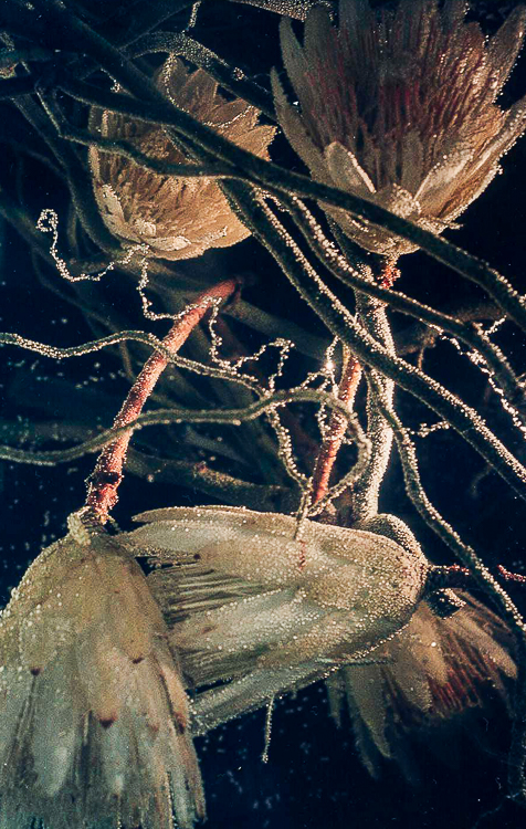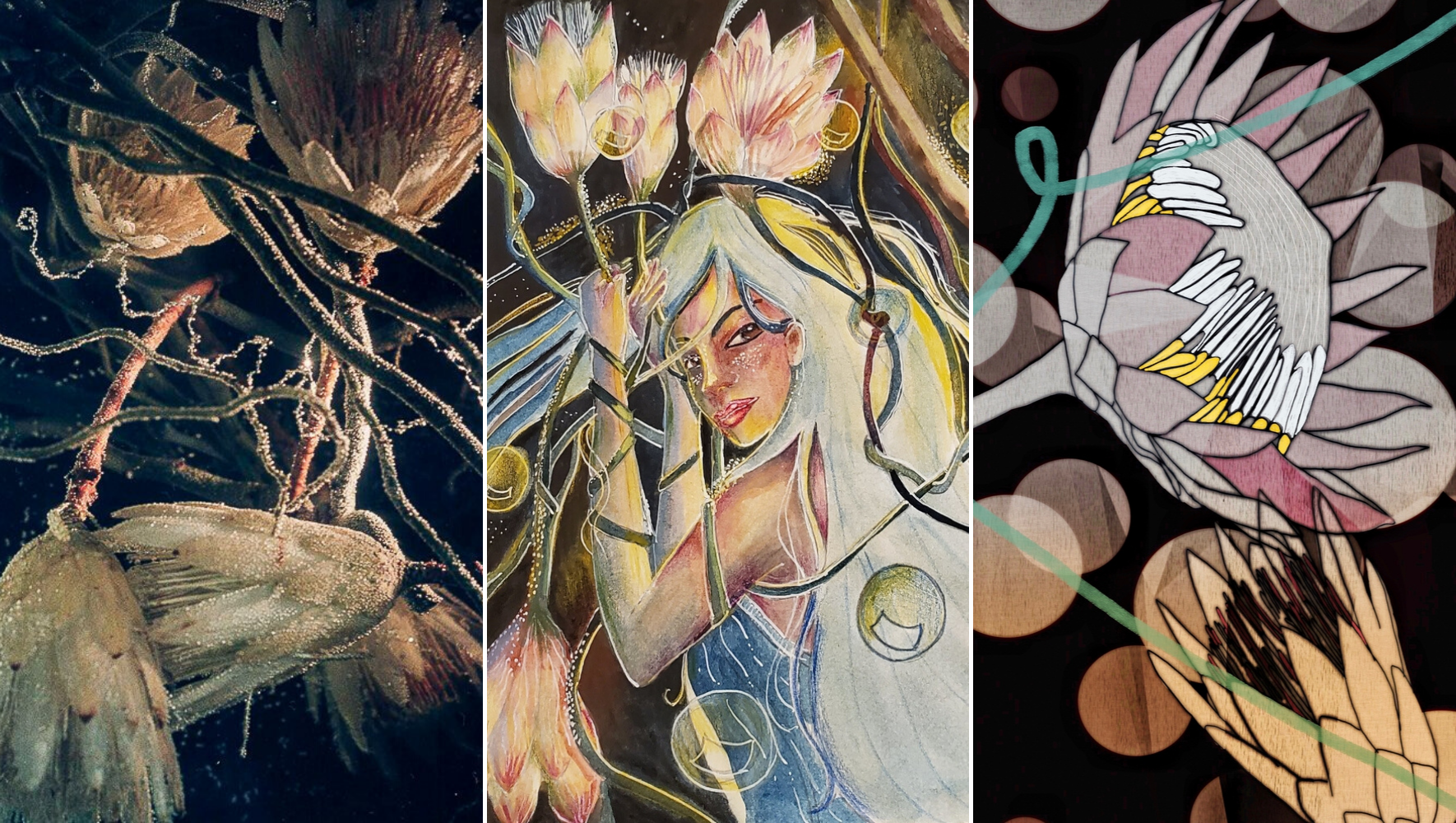 My image for the first panel combined the beauty of some waterlily-like proteas submerged underwater, with bubbles clinging to the tangles of their stems and sinuous threads. I took the original photograph at one of the annual Melbourne International Flower and Garden Shows.