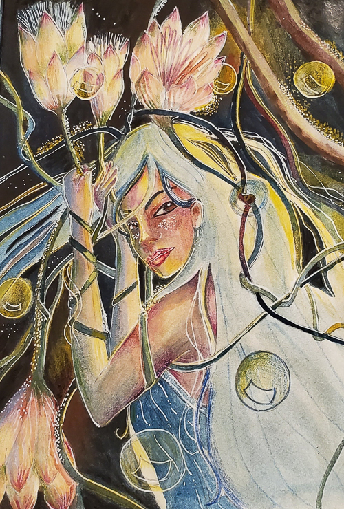 I immediately fell in love with Indrani's watercolour painting for 'Tangles' at first sight: How she has redesigned the waterlily-like proteas to still face both up and down. And how the other elements in Tangles have been incorporated into her painting: The bubbles and tangles against a dark background. And then the Icing on the Cake was an exotic and gracious Tangle Goddess. Definitely not a Goddess to be tangled with: With a beauty so captivating and a direct gaze so penetrating in an underwater world so magical. I was absolutely delighted that it stood in union next to Tangles 1.