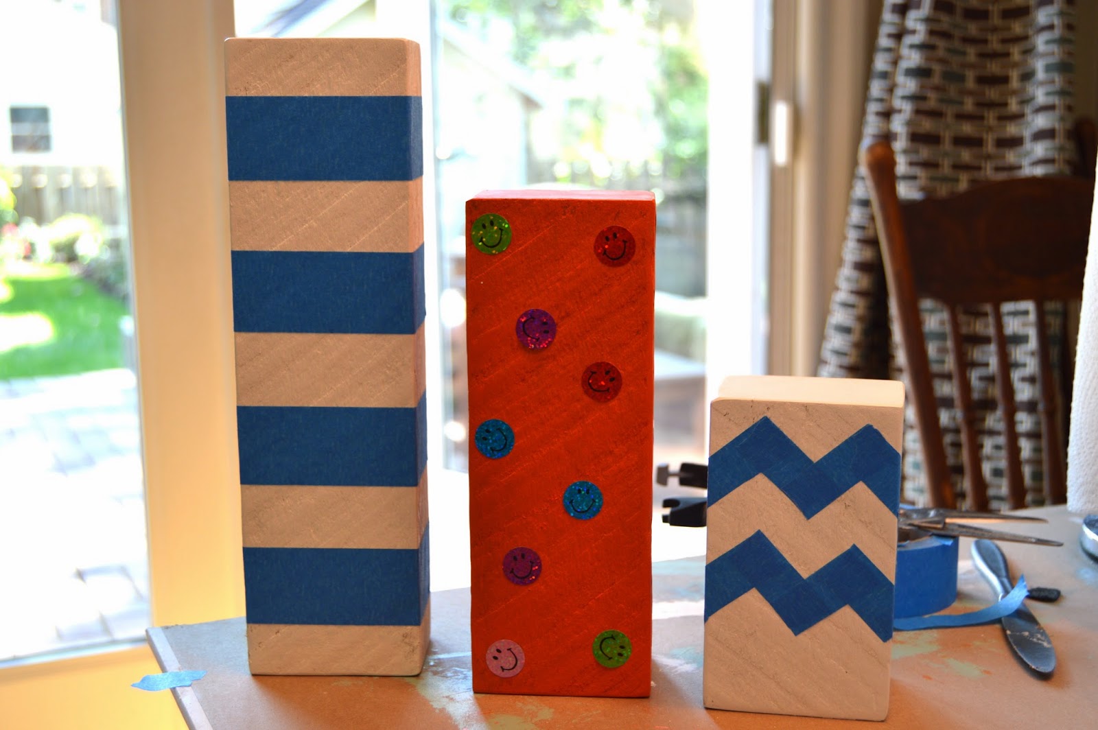 After the paint had dried, we taped off our examples on the pieces. For the polka specks, we utilized the main circles we had - smiley confront stickers. The chevron design was somewhat more disappointing in light of the fact that we just had the wide blue painters tape. I would not like to go the distance to the handyman shop for a senseless part of tape so I cut the more extensive tape into thin strips. Did it turn out great? Nope - yet Emma continued advising me that we weren't going for culminate. Brilliant young lady.