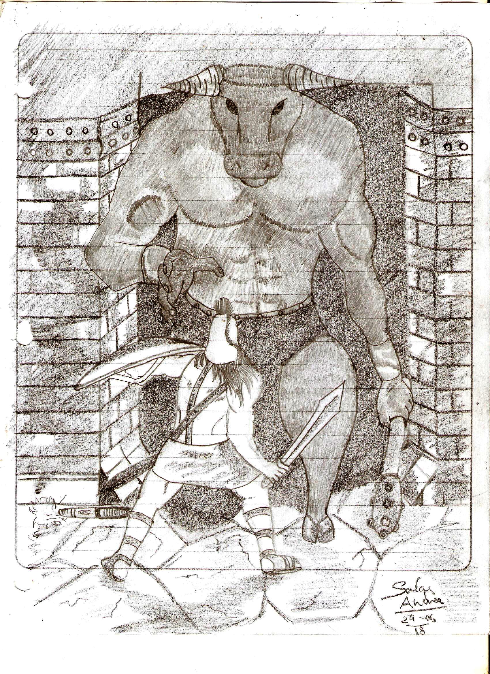Poseidon, raised from the sea a white bull which Minos promised to sacrifice in his name. However, enthralled by the qualities of the bull, Minos decided to hide it among his flock and sacrifice another bull mistakenly thinking that Poseidon would not notice the change. The god of the ocean, when he found out, full of anger, caused Pasiphae, wife of Minos, to uncontrollably desire the white bull and with the help of Daedalus, who created a wooden cow covered in real cowhide, he managed to mate with the bull getting pregnant.