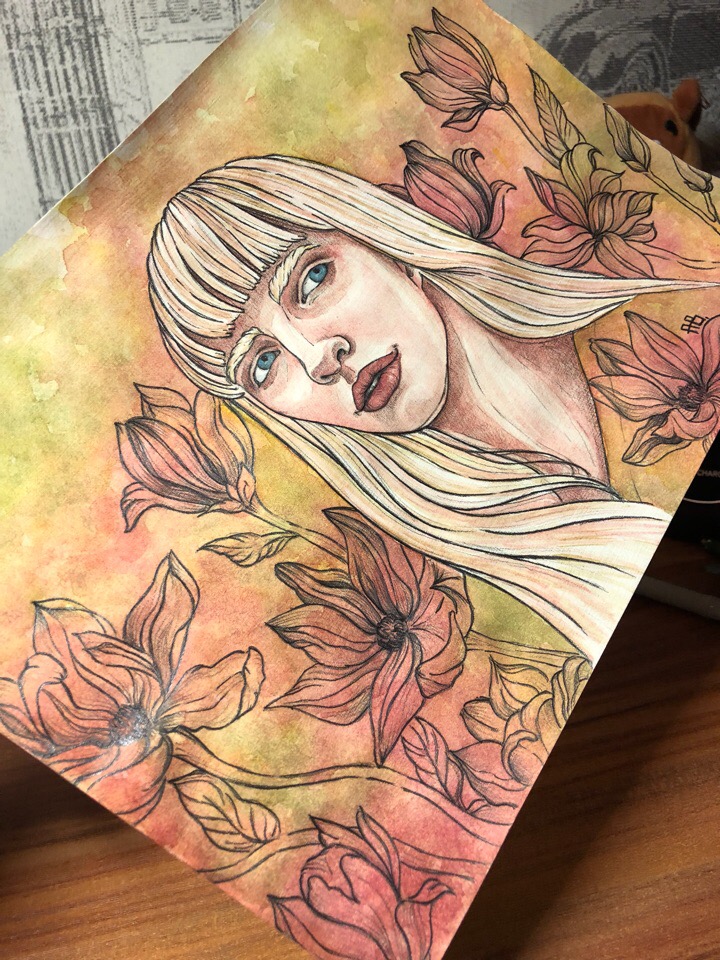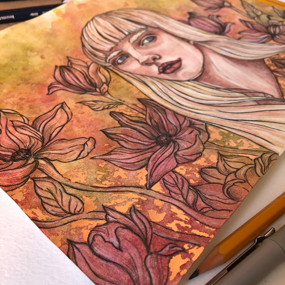 А теперь немного о материалах: основа выполнена графитовым карандашом, далее слои акварели и проработка деталей поталью, линером и белым акварельным карандашом ✨