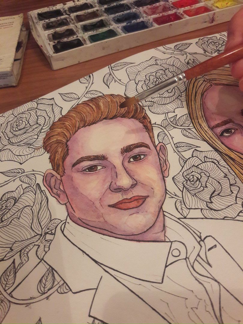 A few more steps and a portrait of the couple in love will be ready.