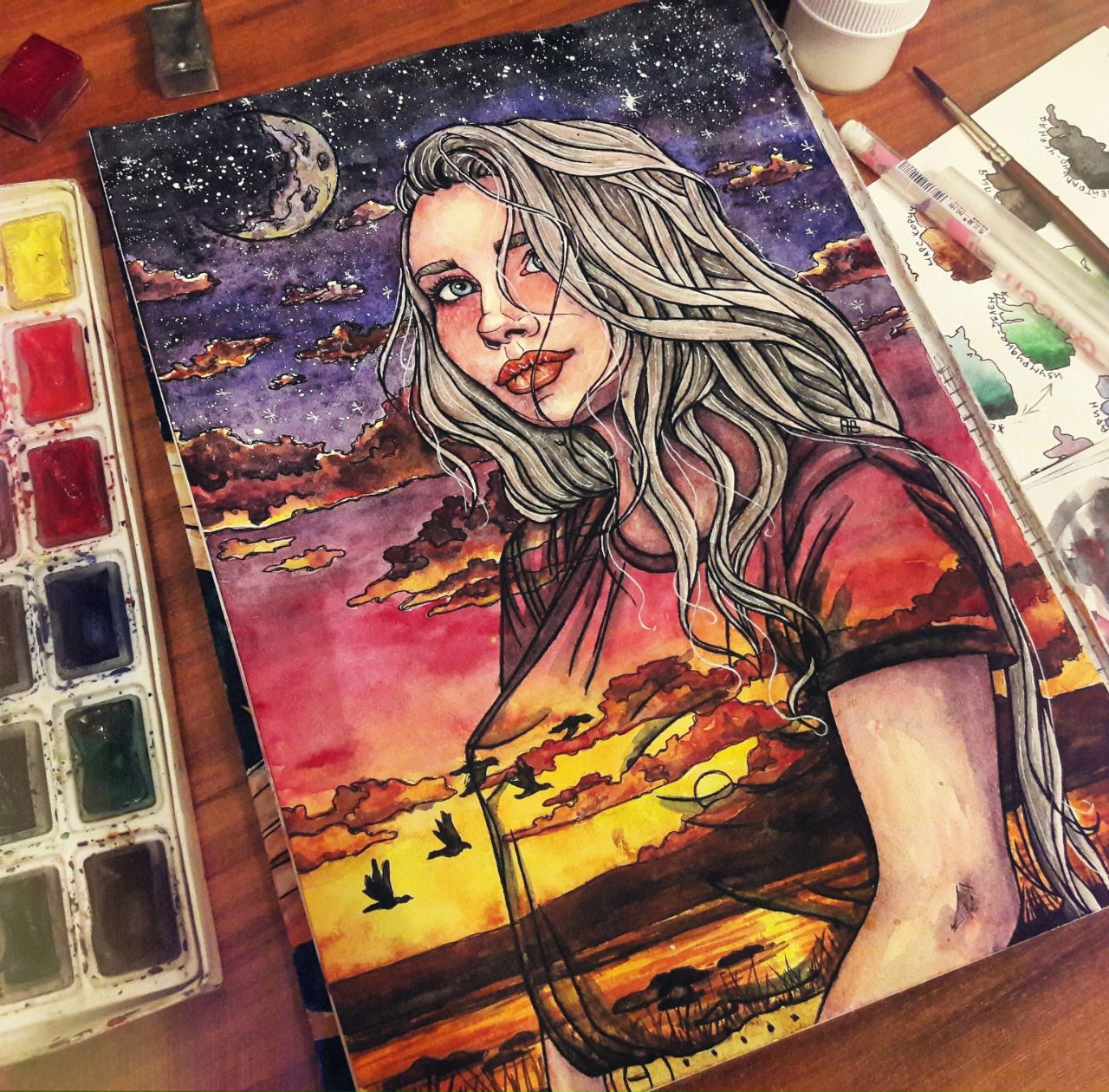 Materials: watercolors, gouache stars, lines of ink