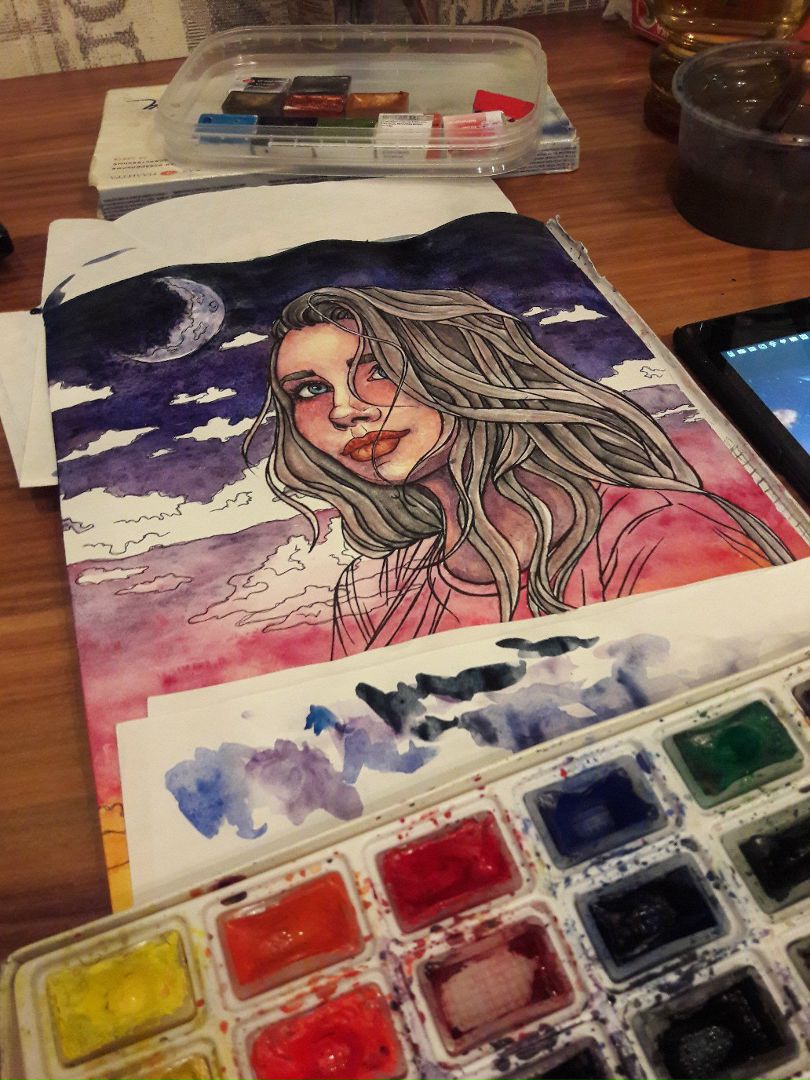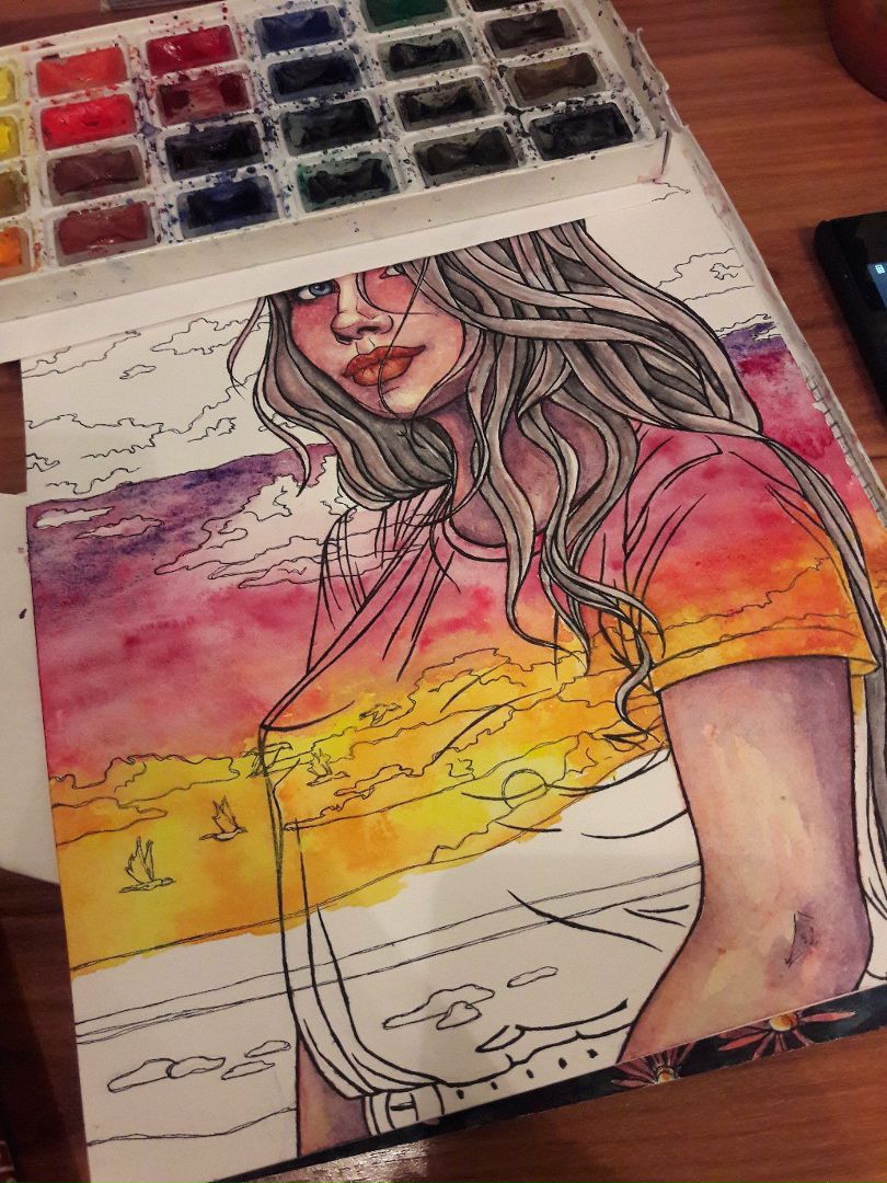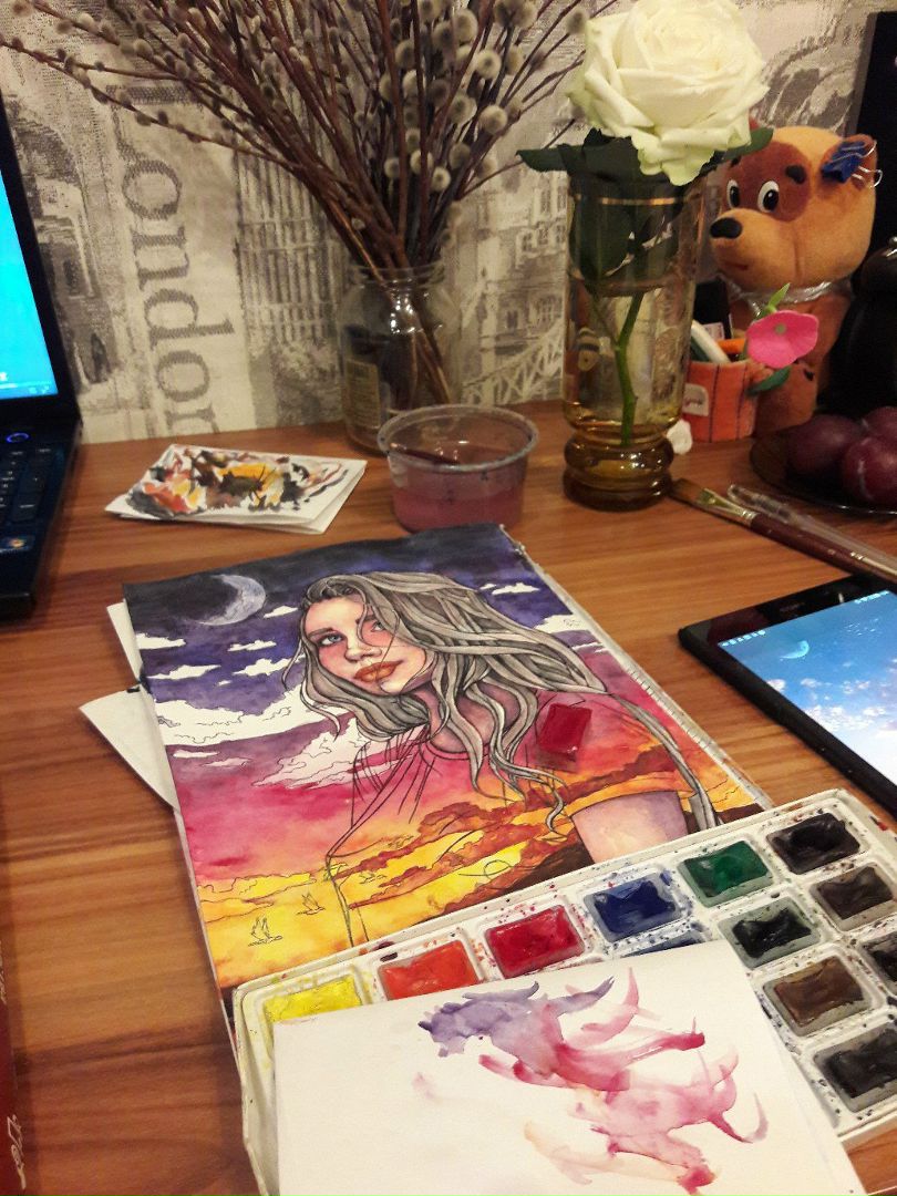 My work is completed "Bright watercolor sunset ":