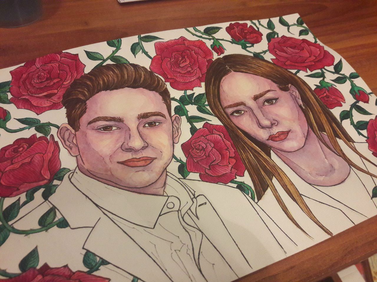 Привет дорогие друзья! Я продолжаю рисовать влюбленную пару. Так потихоньку я уже начала рисовать розы. Осталось совсем немного всего примерно 1 или 2 этапа. Думаю, что к завтрашнему дню я закончу этот портрет. Я рисую эту пару на фоне роз. Розы это самые романтические цветы. Я люблю розы. Они так сладко пахнут и имеют шикарный вид. Ведь не зря мужчины зачастую когда просят женщину выйти за него замуж берут обручальное кольцо и розы. Это так красиво. Хватит даже одной розы, что бы сделать подарок романтическим. Мне нравится рисовать эту пару.
