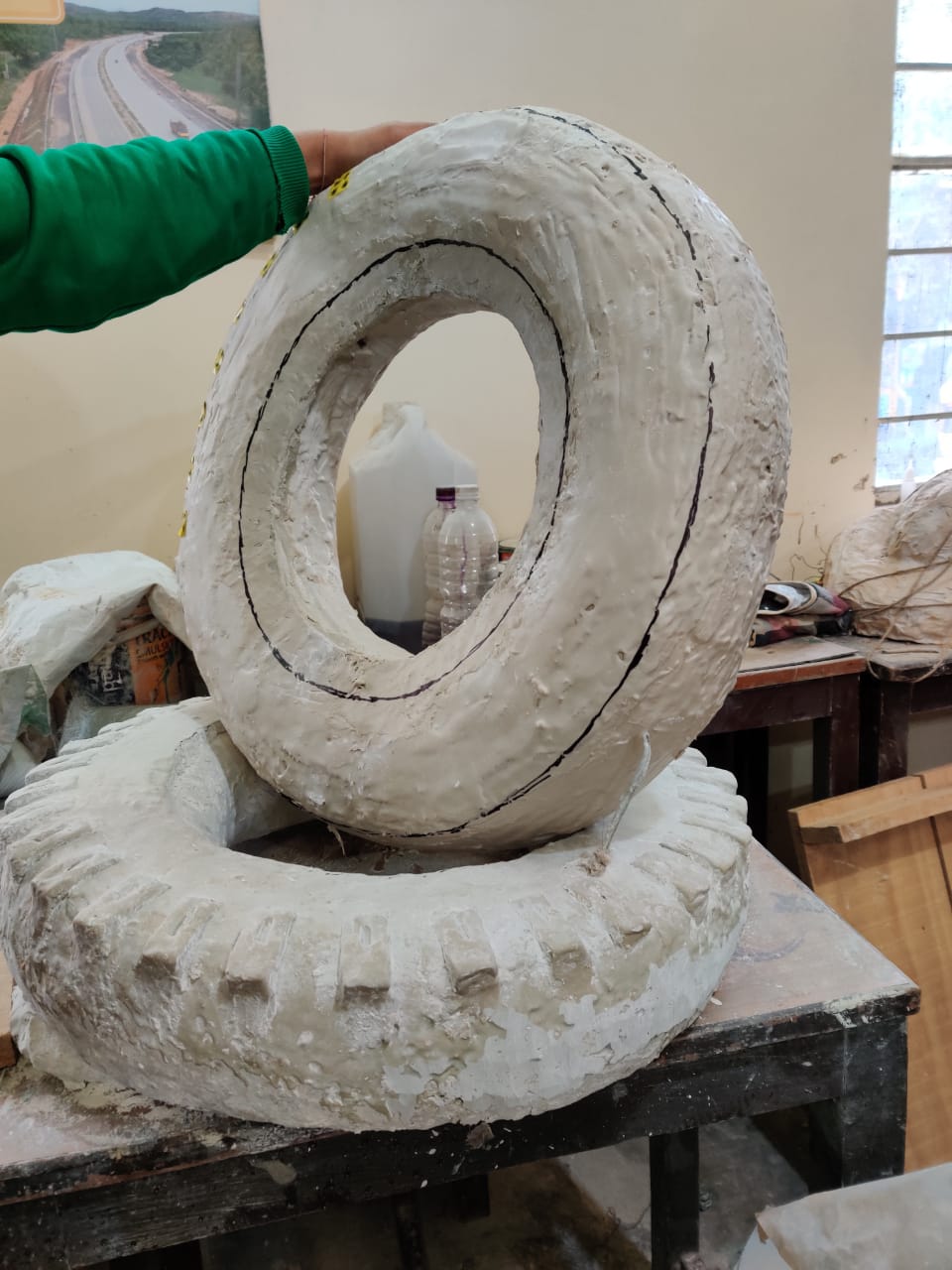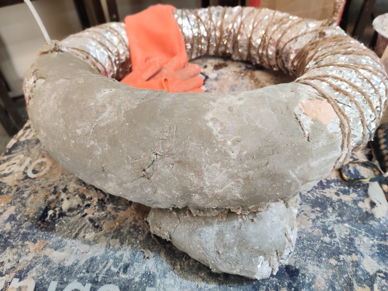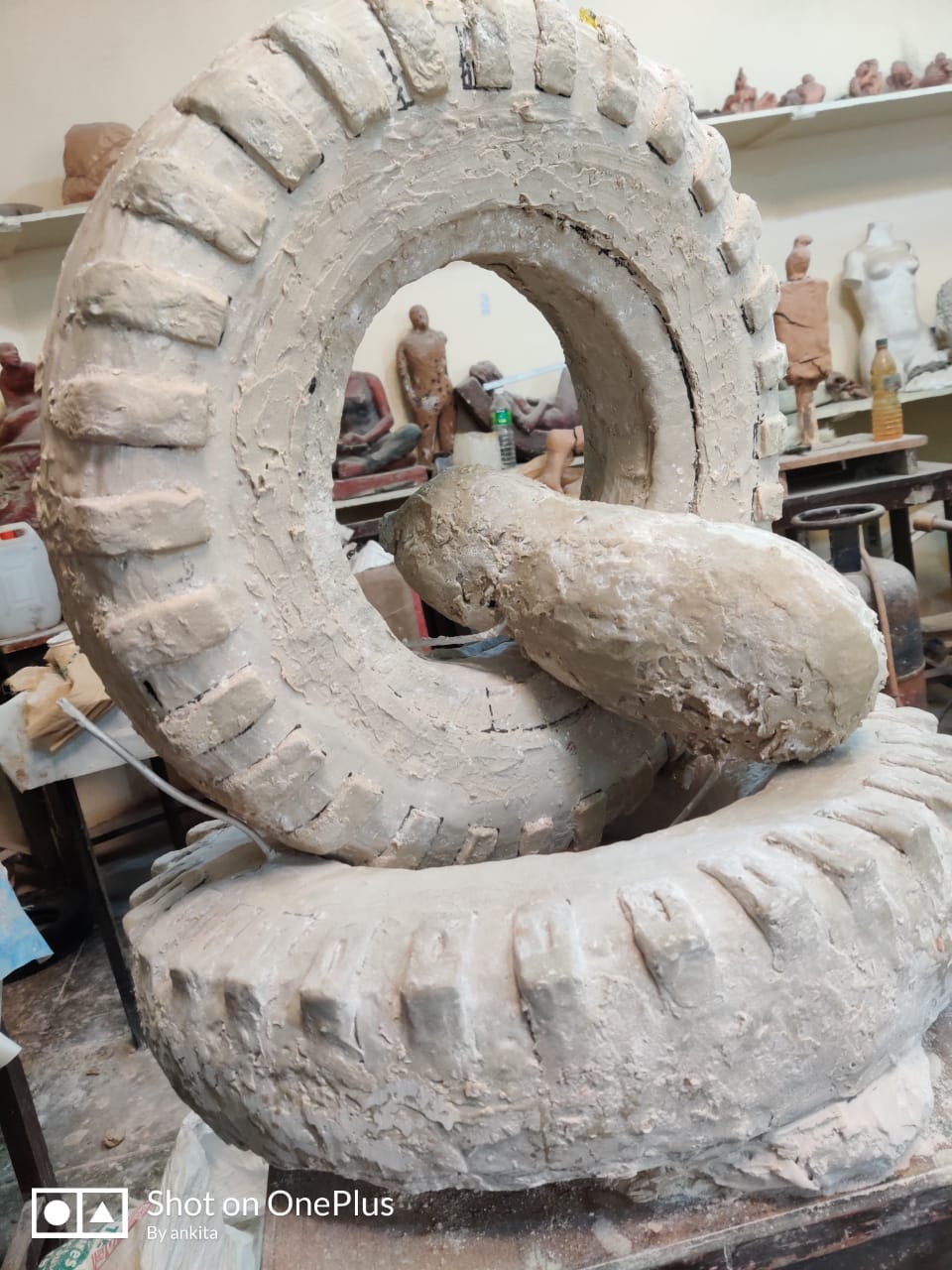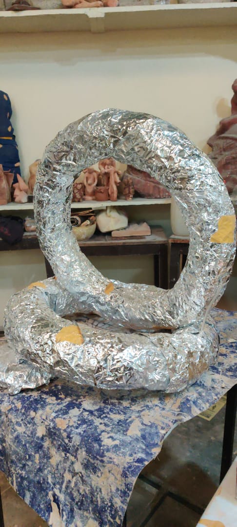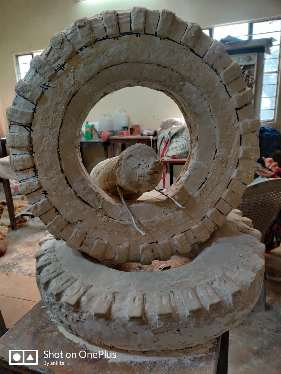 I wanted to try and learn how to directly use mediums without first making it in clay and then taking it's mould, so for the armature i used a wooden round frame and then wrapped foil sheet and newspaper around it followed by one thin layer of resin mixed with chalk powder then plaster of paris( p.o.p) and then again resin for detailing.