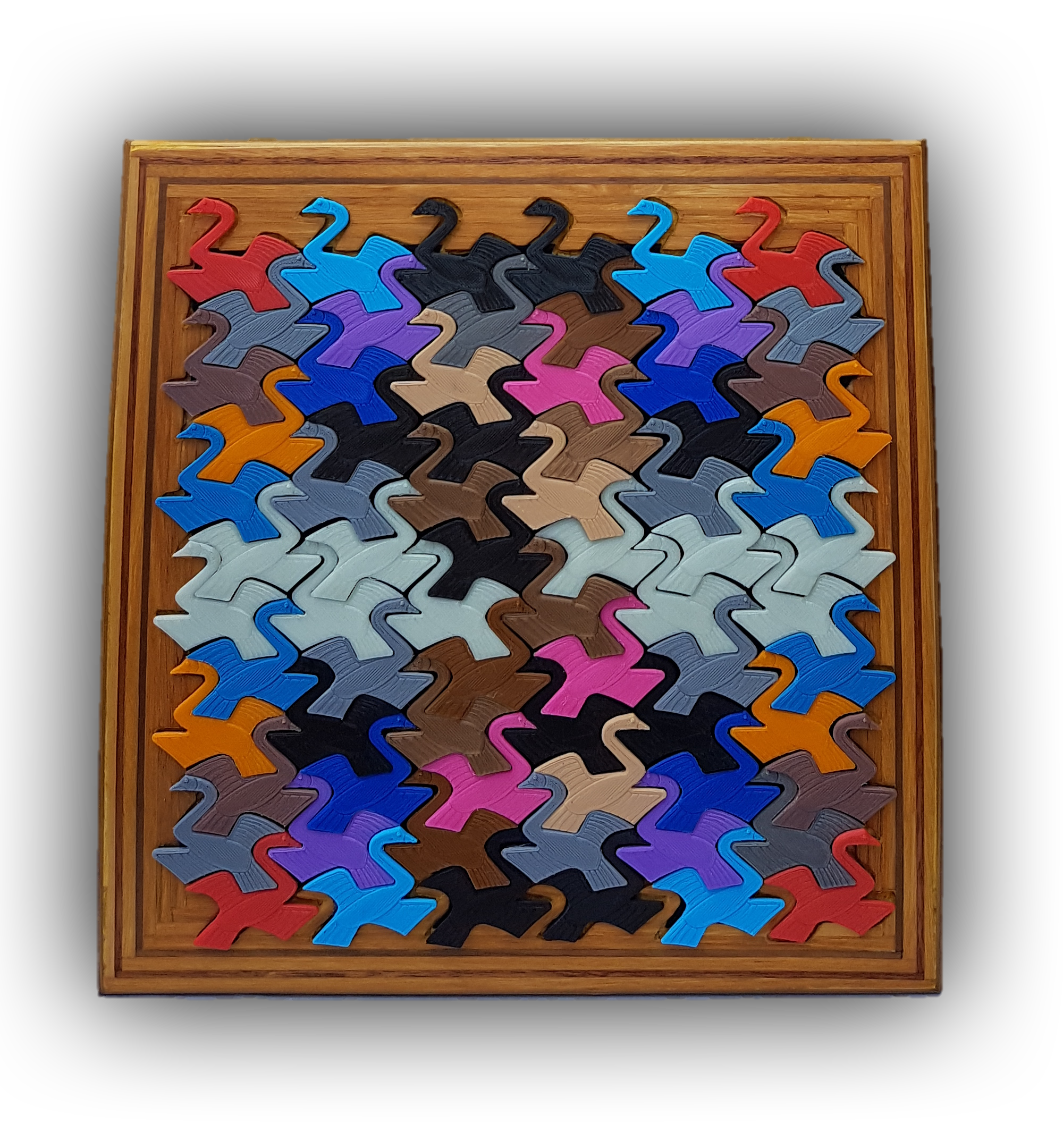 With VELCRO on the back side they are removable and reassemblable to obtain hundreds of different color configurations (they are real interactive puzzles). The frame are wooden inlayed.