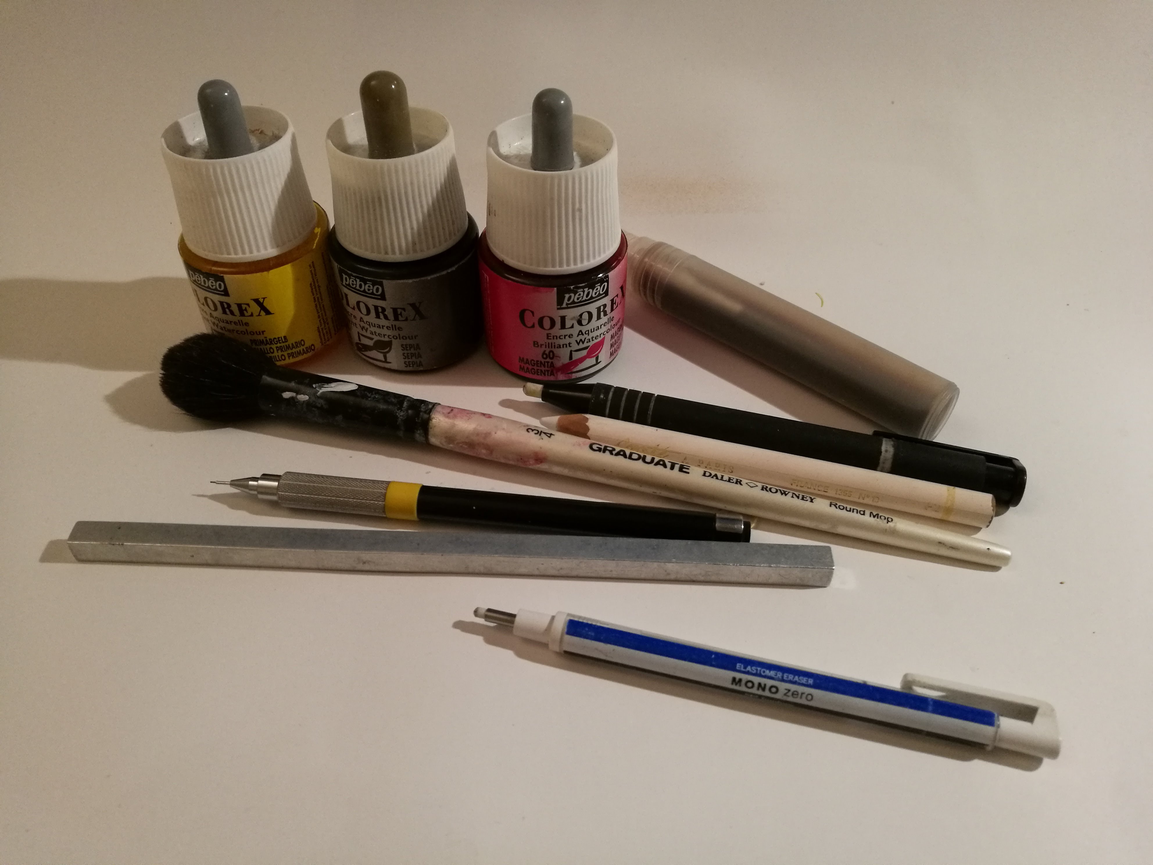 I used a propelling pencil, a while pencil, two erasers, and a small sprayer filled with watercolor (for the background, with yellow + magenta + sepia) :