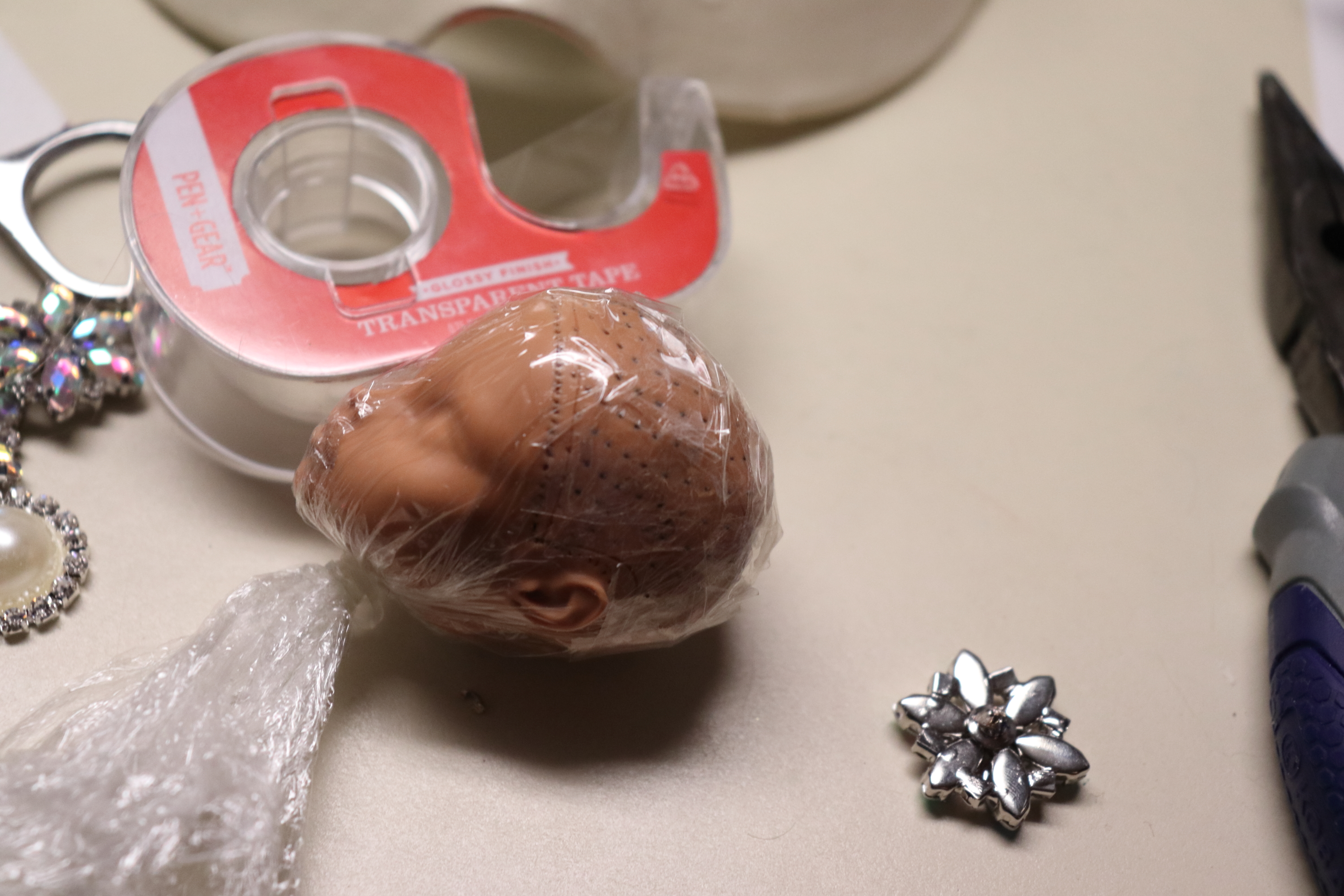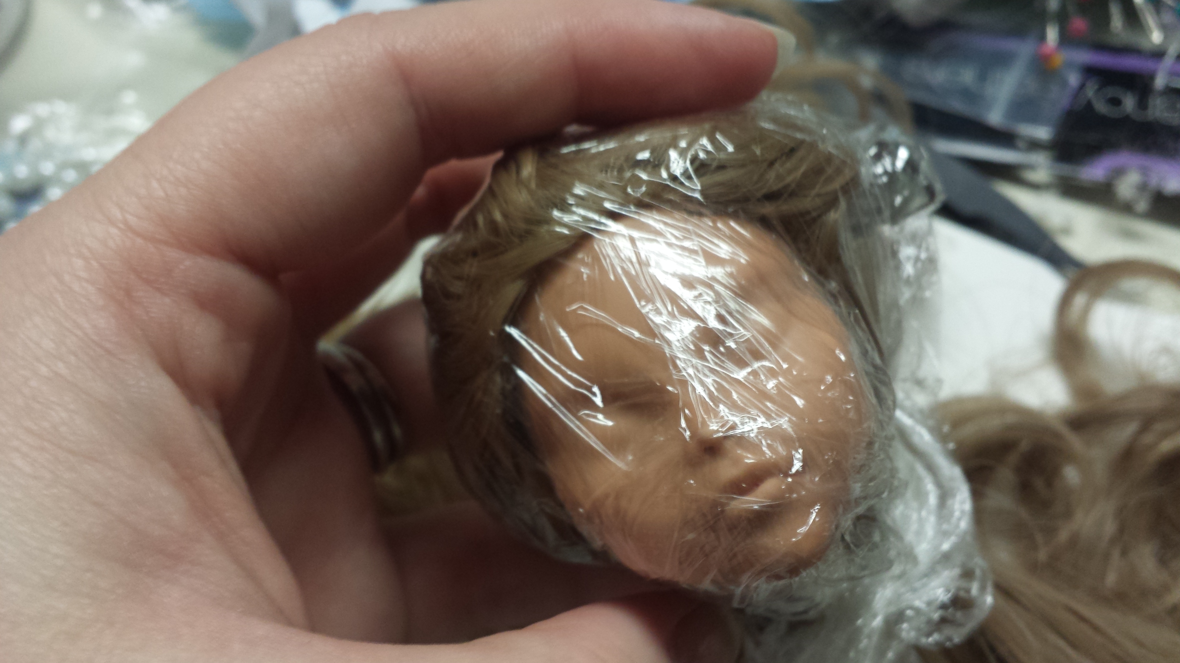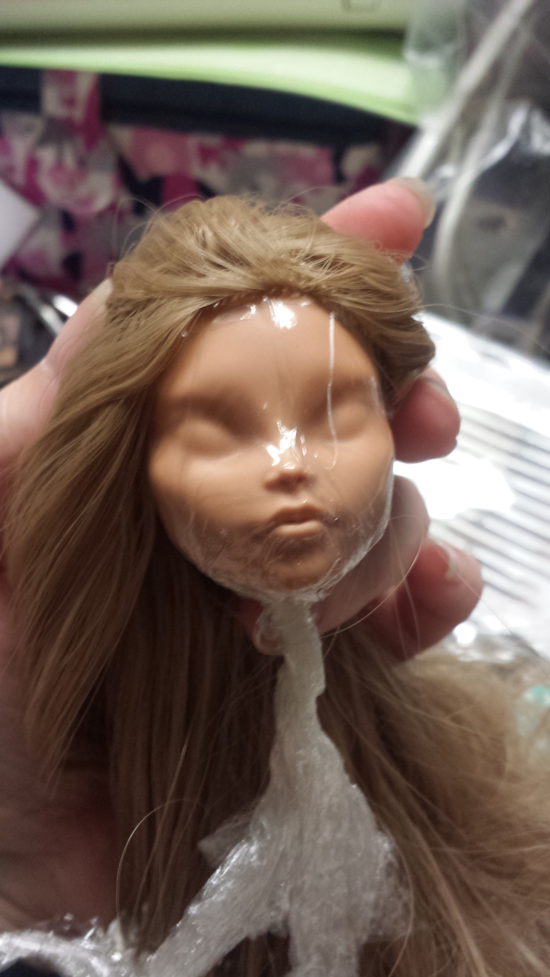 The first step is to remove the head, cut the hair, and remove the original paint. How you do that is you cut the hair as close to the scalp as you can, then put the head in warm water or use a blow dryer to warm it up to soften the plastic of the head for it to come off. After, you remove the hair from the inside with a pair of tweezers. The heat used to remove the head should also soften the glue a little. Then, take some cling wrap and securely put it on the head. So when you're done with aaaaall that, it should look like this:
