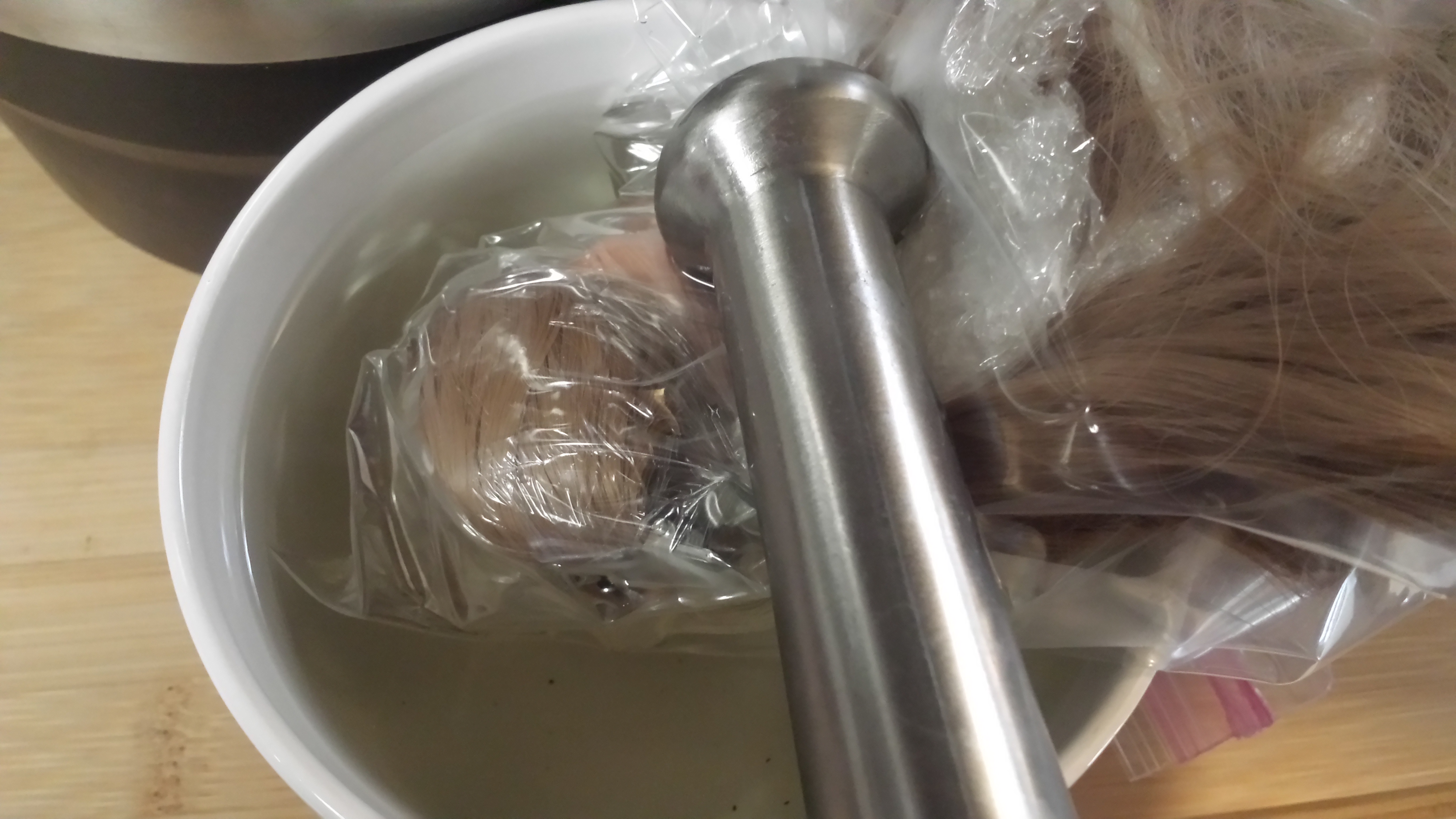 Next, in order to get the hair to stay in place, you want to heat it using a blow dryer or hot water. If you use water, make sure you use something to keep it down in the water. It takes about ten minutes with water, and probably slightly less time with the dryer, though you'll have to hold the dryer. Don't forget to put her head in a sandwich bag to keep those curls from getting wet!