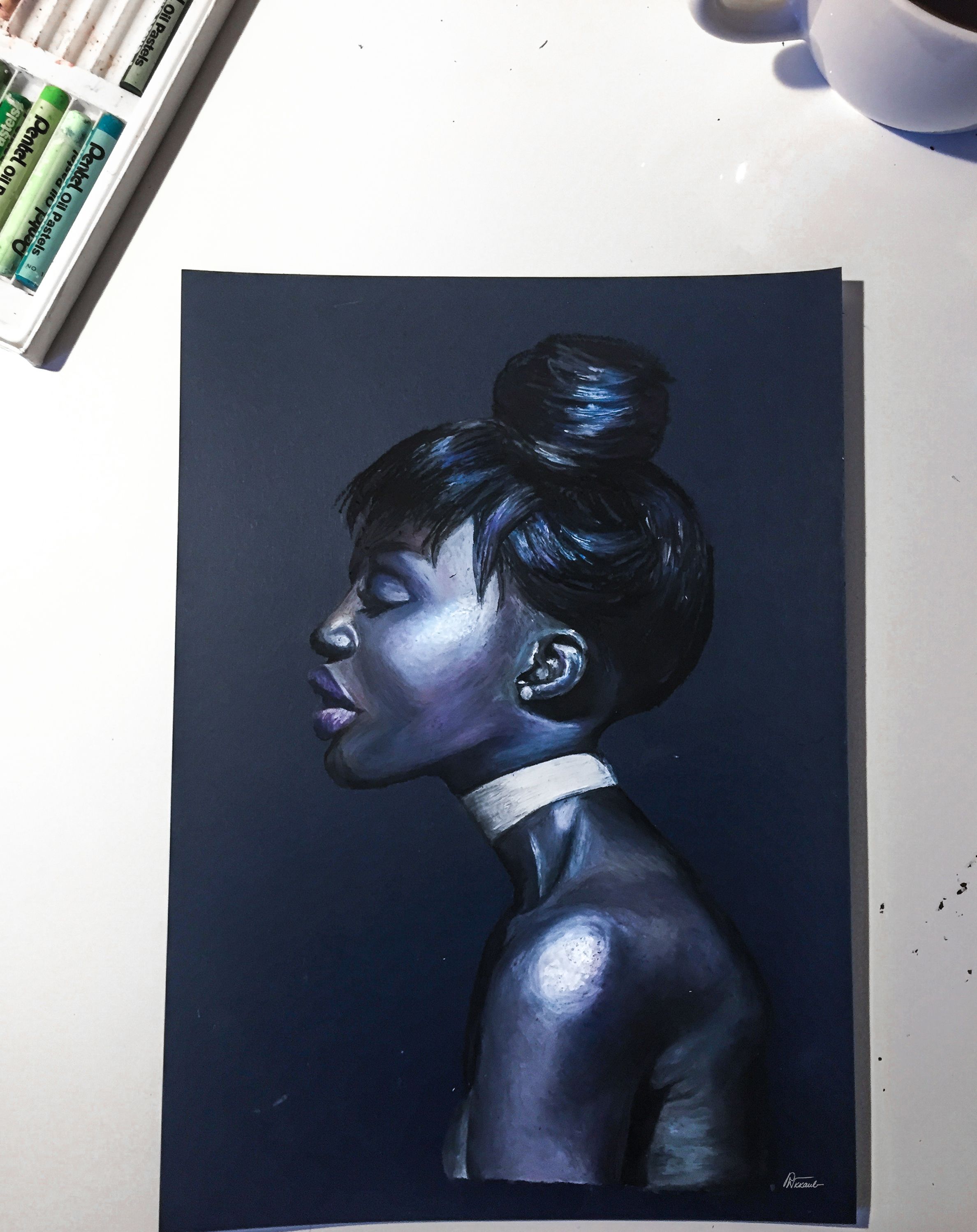 I came across a beautiful image, and I immediately felt that it had to be painted. For quite a time, I had wanted to experiment with oil pastels on background, especially, when painting human faces.