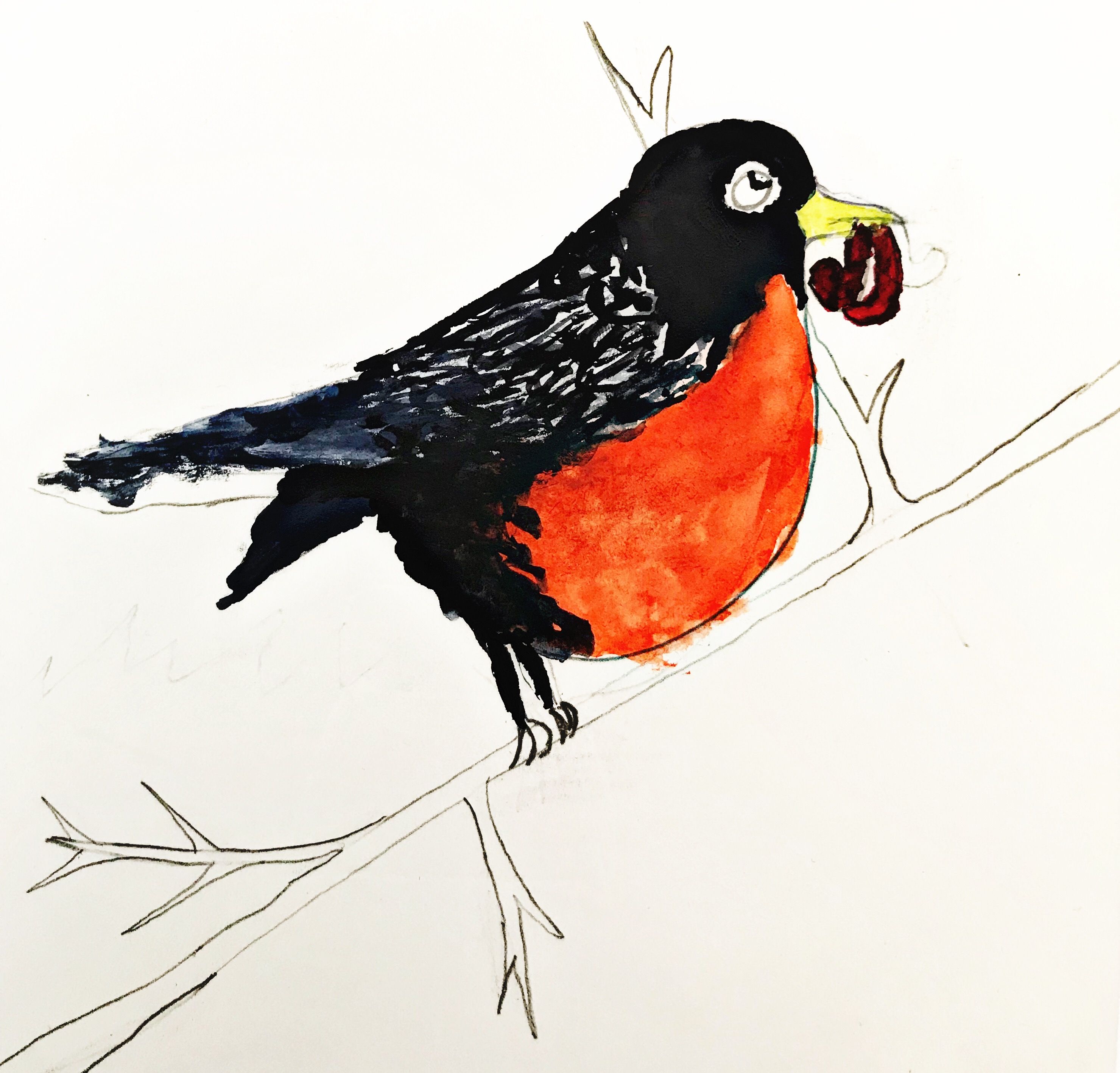 @web-gnar: Watercolor painting of a robin. Robins are dying because the ground is still frozen and they have migrated back hoping to eat worms but the worms have not come out.
