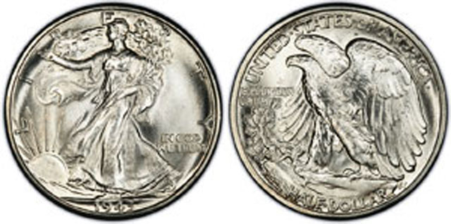 To design the front of the coin, Adolph chose the figure of Liberty, who was facing the dawn of the new day, with the glow of the sun behind him, the figure of Liberty depicted carrying branches of laurel trees and oaks symbolizing civilian and military glory. And the back, depicting a majestic eagle perched on a mountain cliff, with its winged pose of wings showing strength, with a pine tree representing America's leap. This coin was finally stopped manufactured in 1947.