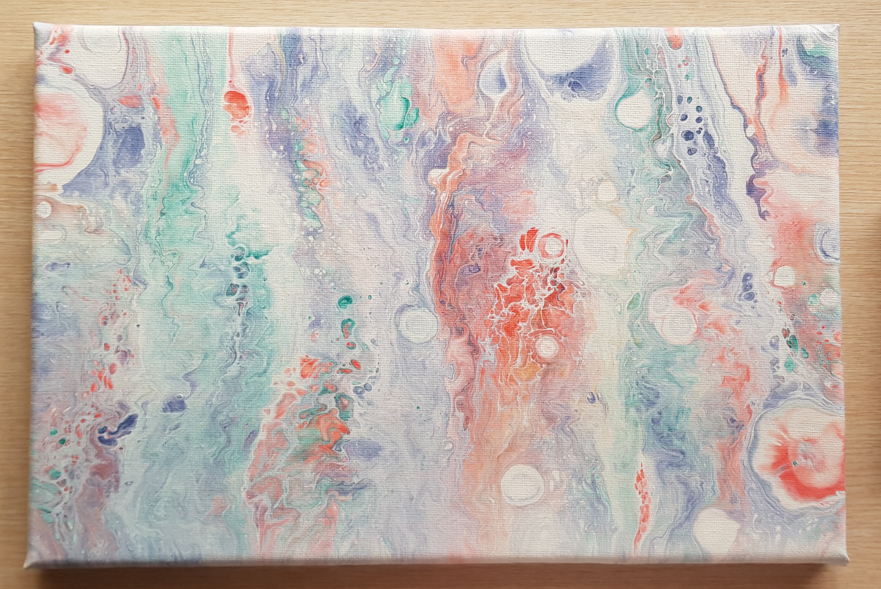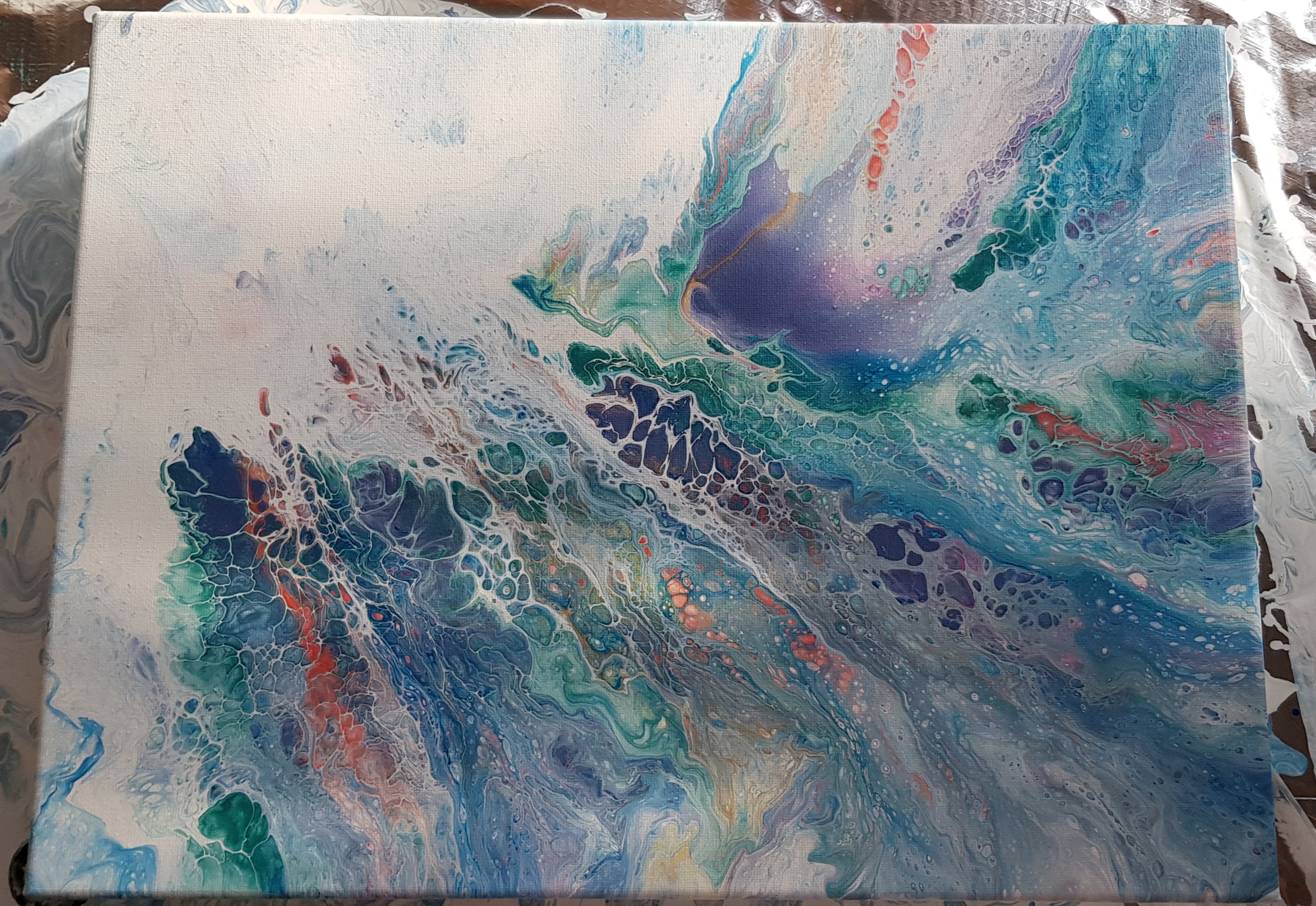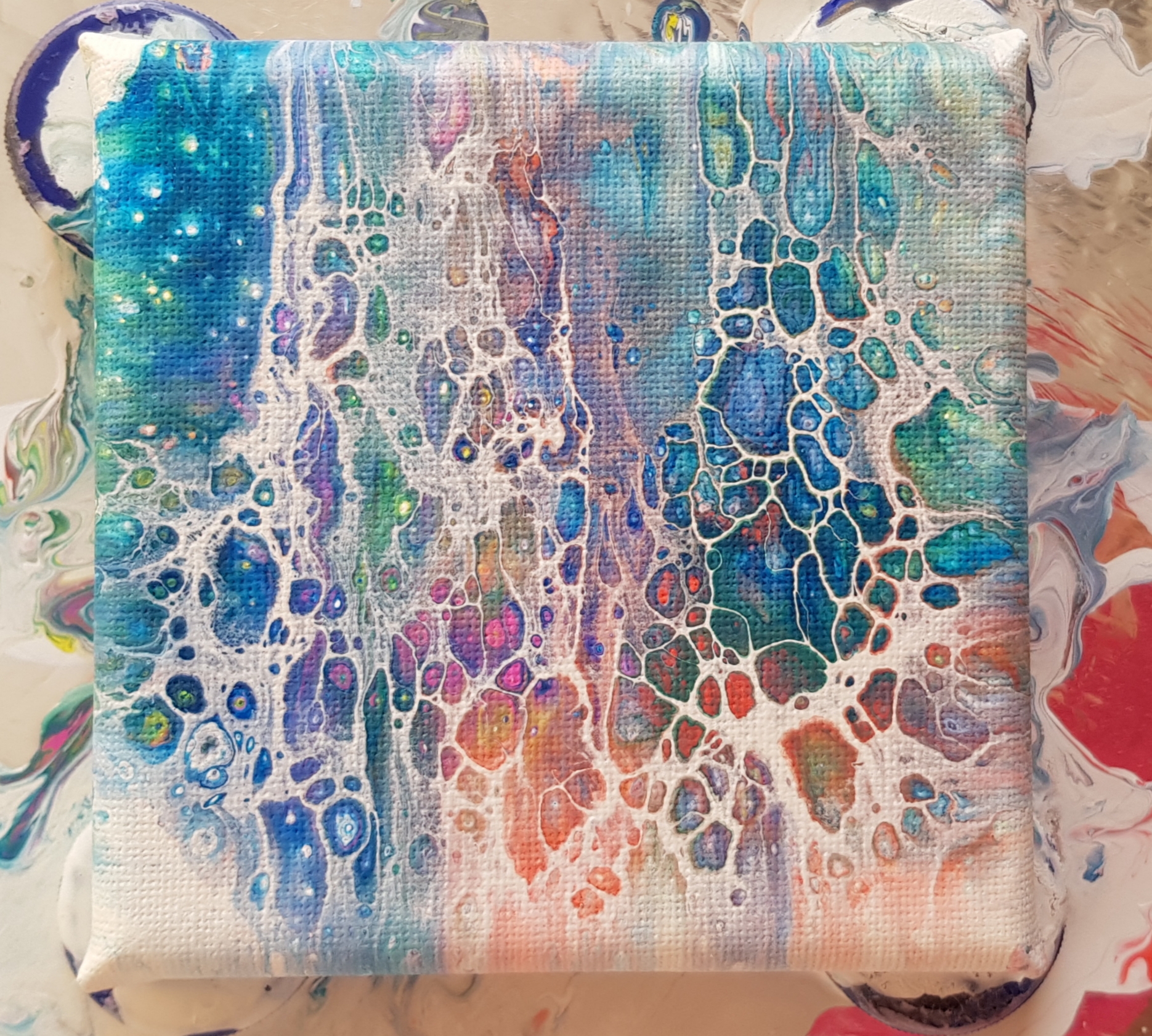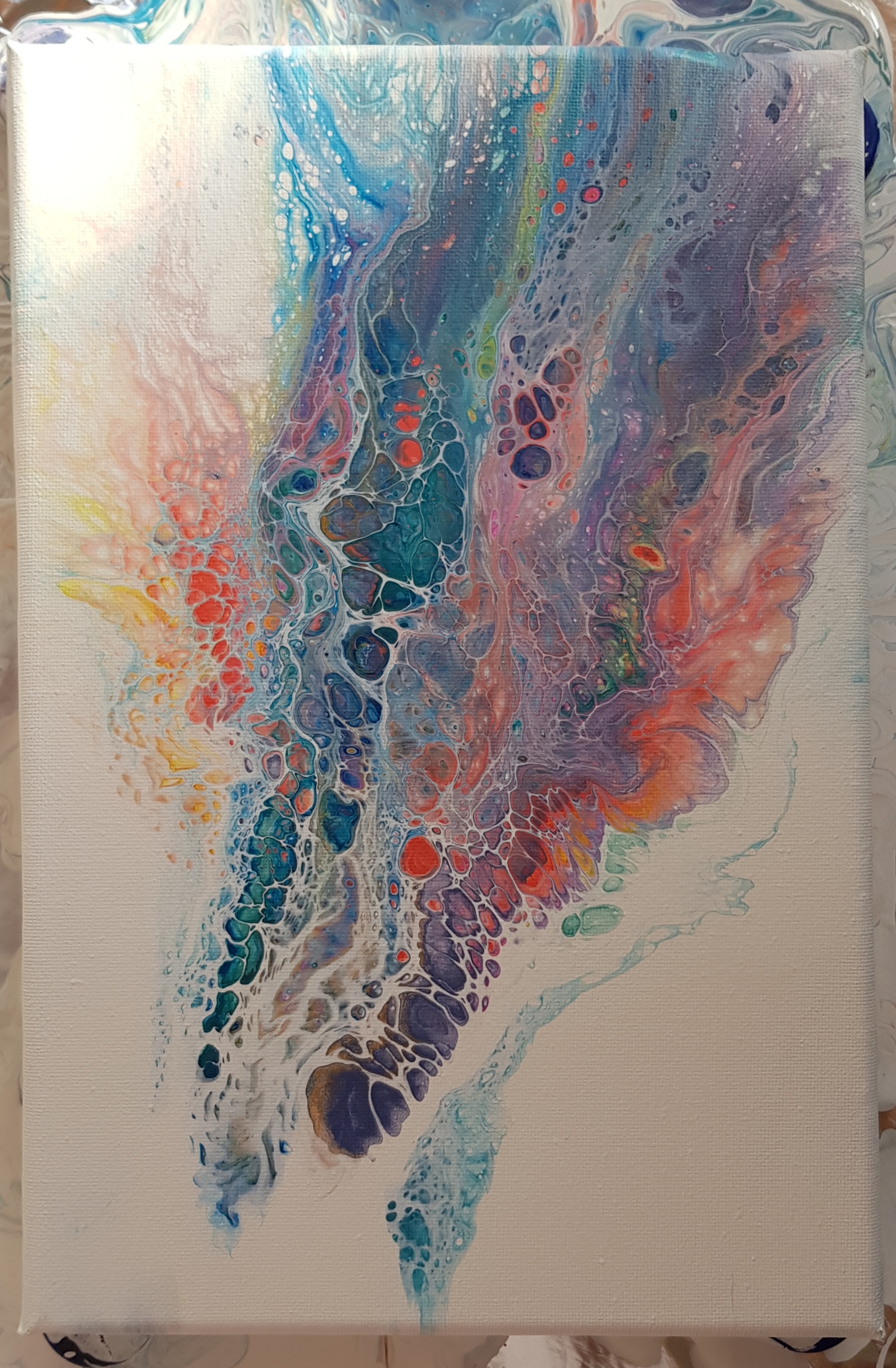 If you compare the two pours from this day you'll see the bigger canvas has big round "cells" ~ that's from the silicone.
