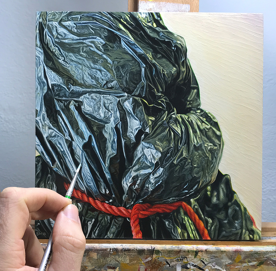 Hi there, long time no Steem! I’ve been busy working on my solo exhibition that opens on the 5th of October at Beinart Gallery in Brunswick. The work for my show is coming together nicely, but I don’t want to reveal anything just yet. I have a number of paintings that I did last year for various group exhibitions that I might post on here if people are interested. The first post I’d like to share after a long hiatus from steemit is titled “Mountain”, which was one of two paintings that I exhibited in the Small Works group exhibition at Beinart Gallery. It’s the fourth piece in my self portrait with garbage bag series. Have a great day 🙂