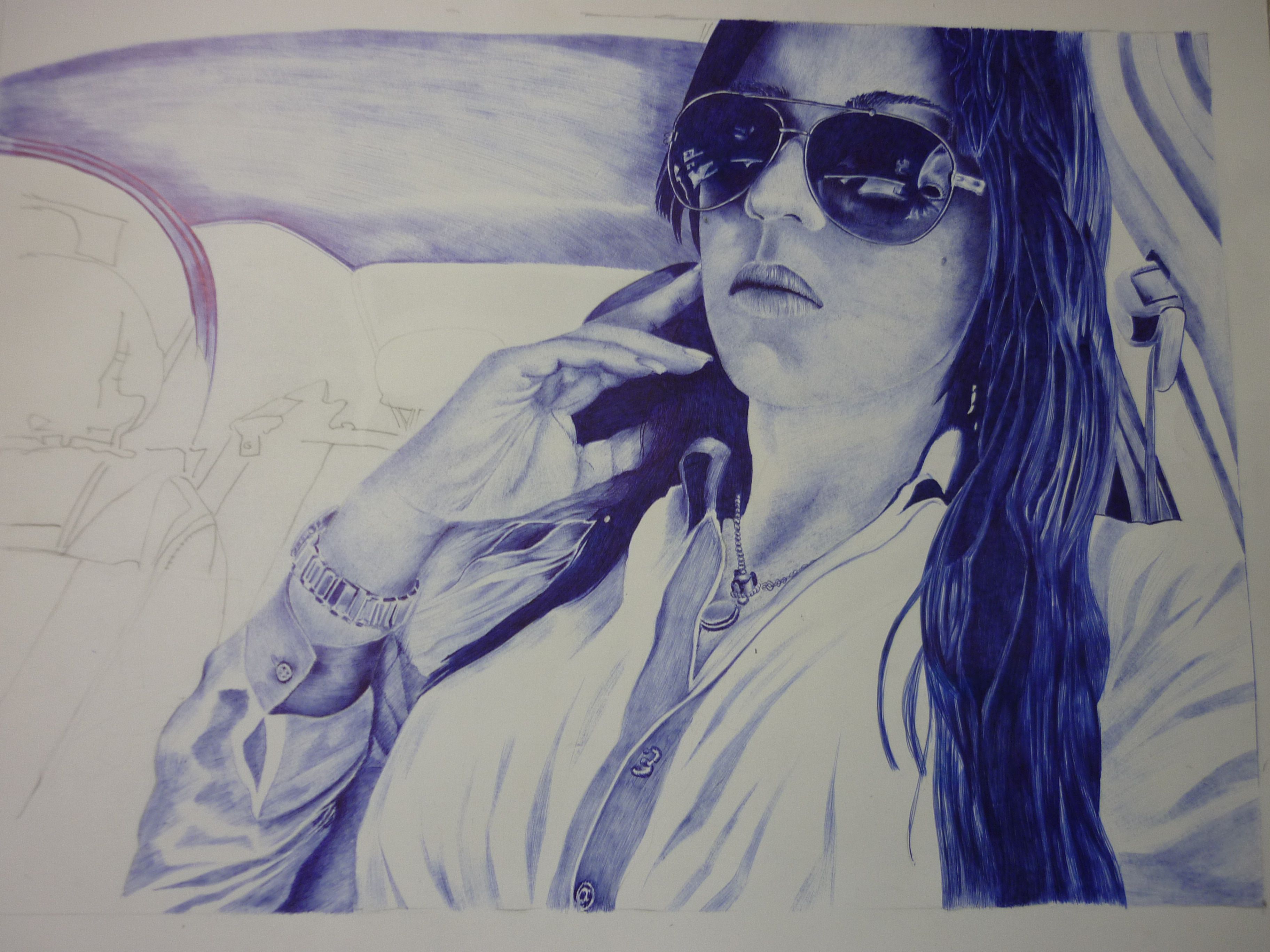 Having already the illustration of my friend Evelin already done in 80% I dedicate myself to realize the surrounding environment that in this case is the internal part of your vehicle, in this case I am guided by the same photograph that I already have in the bluish tone that is the model to follow, and with the same technique I fill in a pattern of very small lines and giving more intensity to the pen in the dark parts.