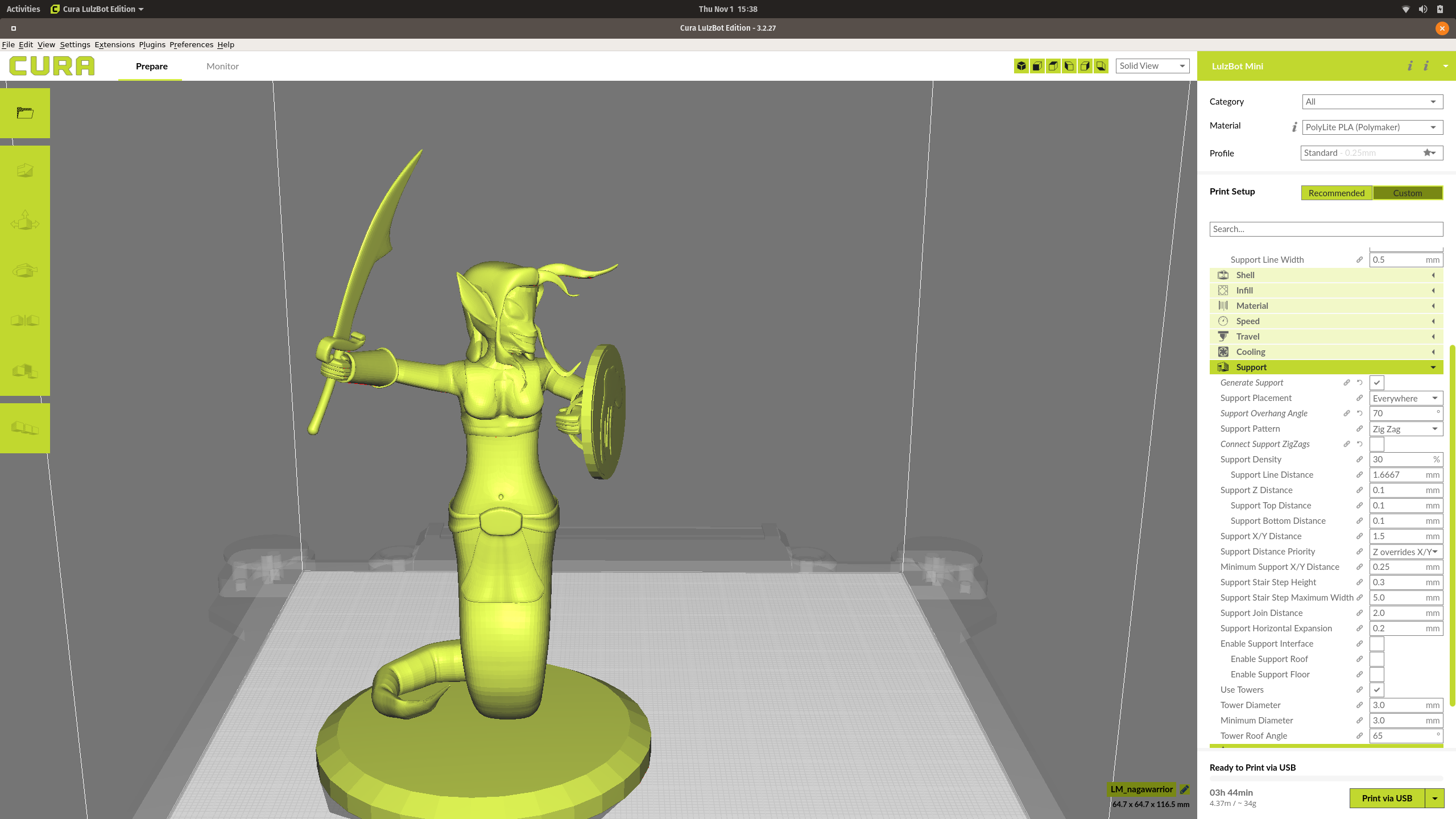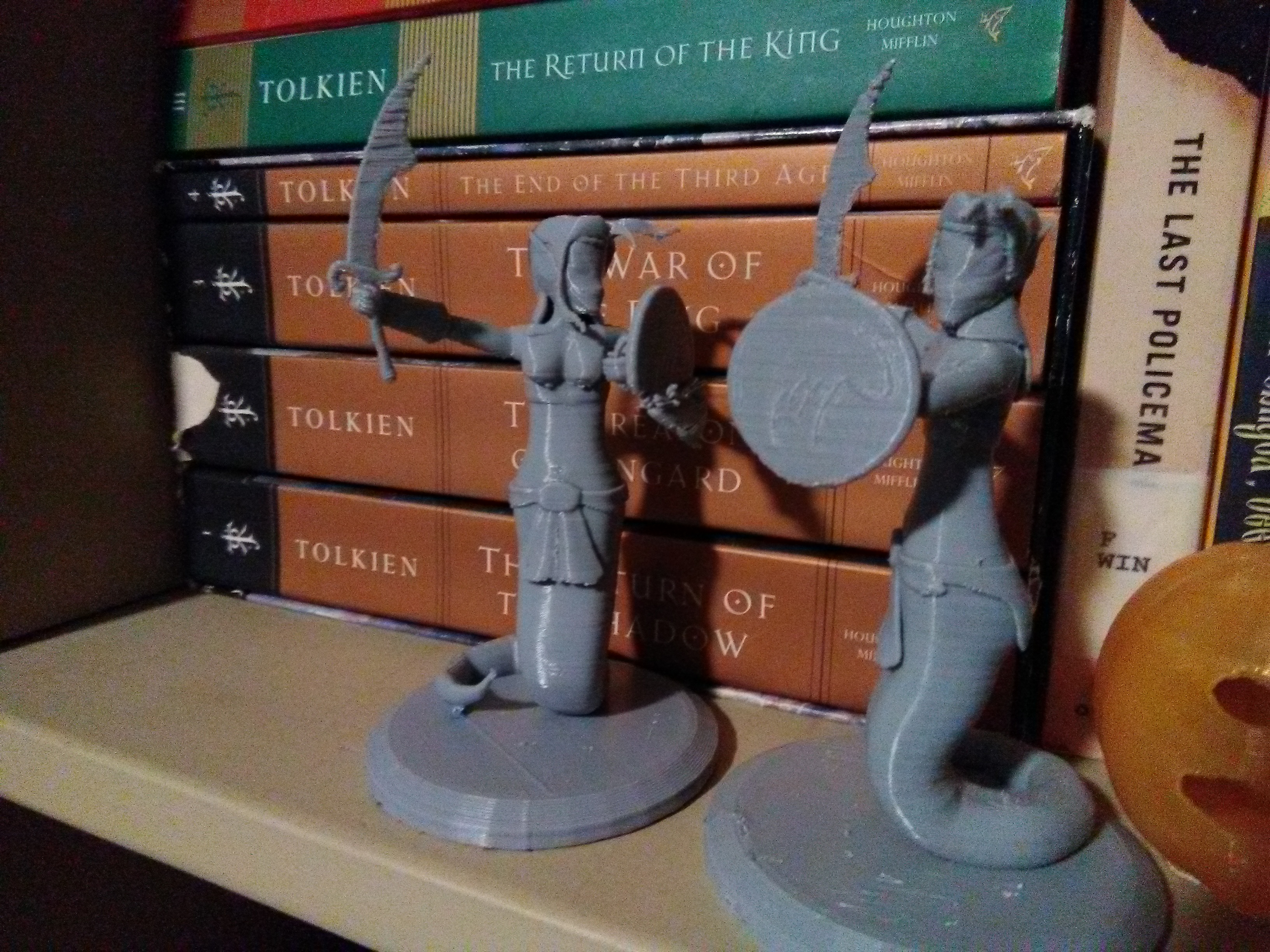 These were printed on a Lulz Bot Mini with the standard print head, in high speed mode, with no post processing. I would suggest if you want to print the naga warrior I would suggest you check her ears and the sword. The thinner the object the bigger the model has to be and her ears have been lost in this print. Also I tweaked the mouth and eyes to show better in the stl I've added to this post.