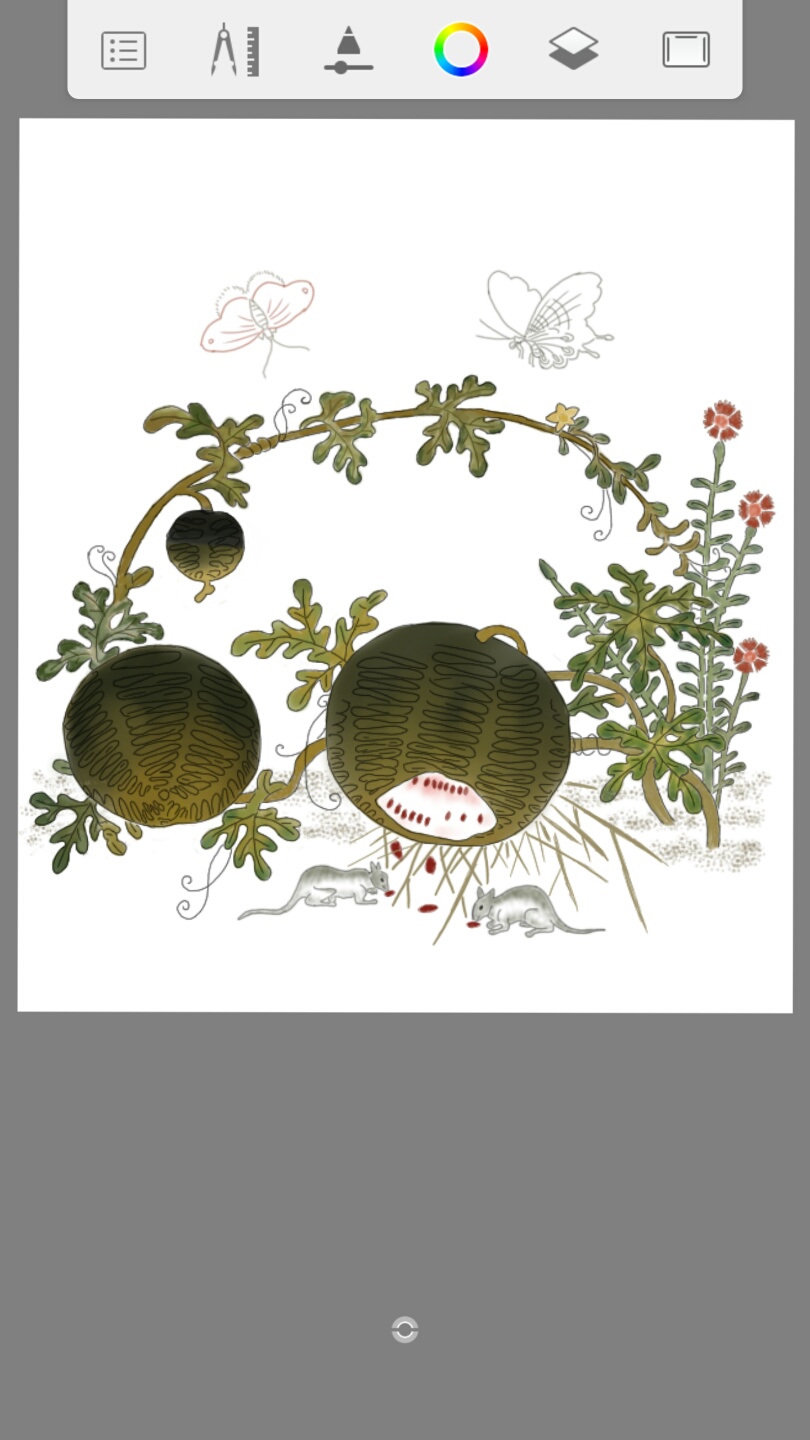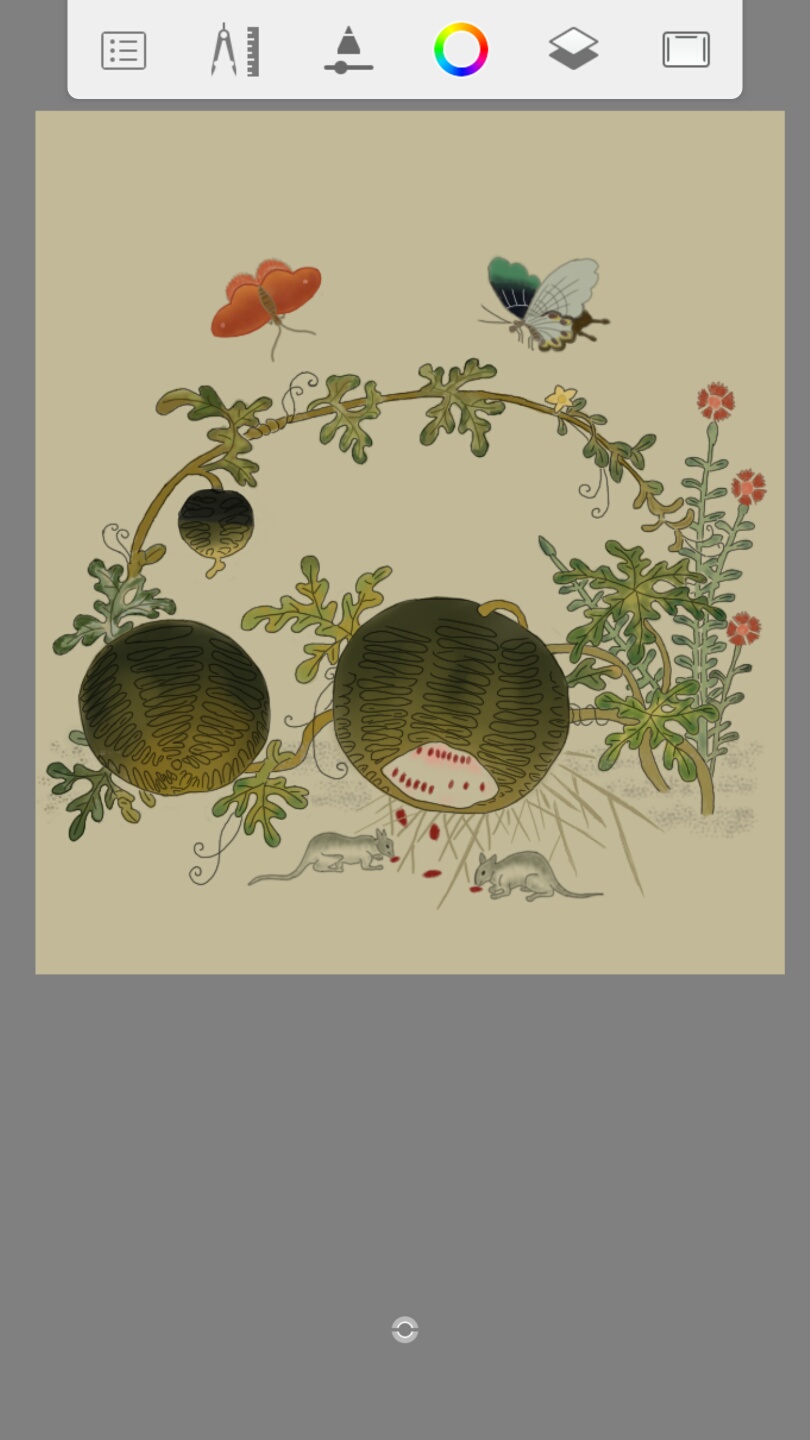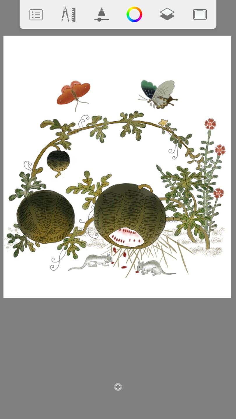 그 끝에는 패랭이가 피어 있고 덩굴 위에는 나비가 날고 있으며, 땅 위에는 쥐 두 마리가 수박을 파먹고 있다.