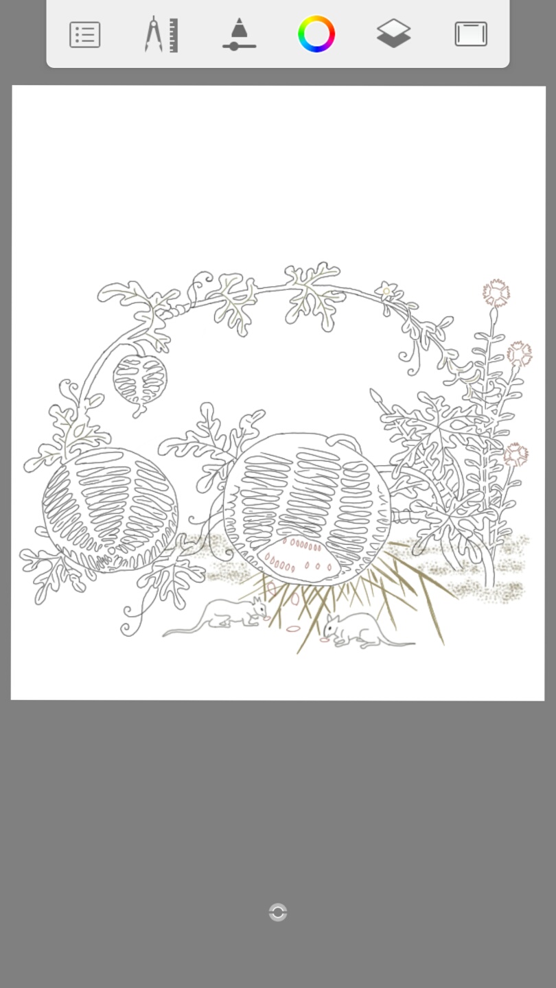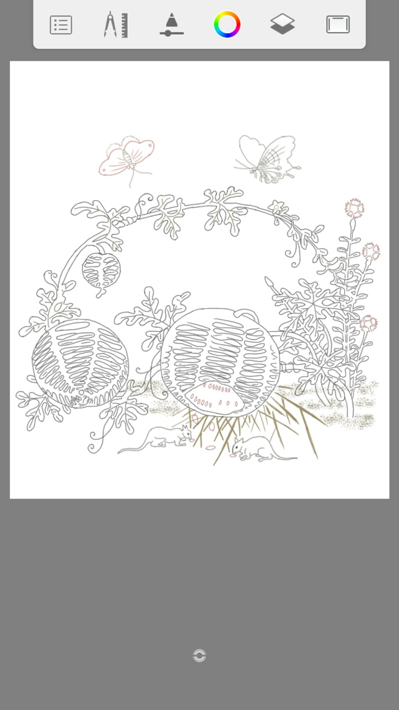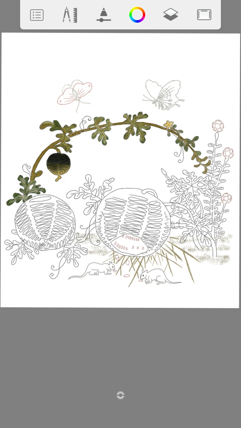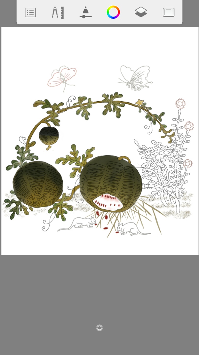 그 끝에는 패랭이가 피어 있고 덩굴 위에는 나비가 날고 있으며, 땅 위에는 쥐 두 마리가 수박을 파먹고 있다.
