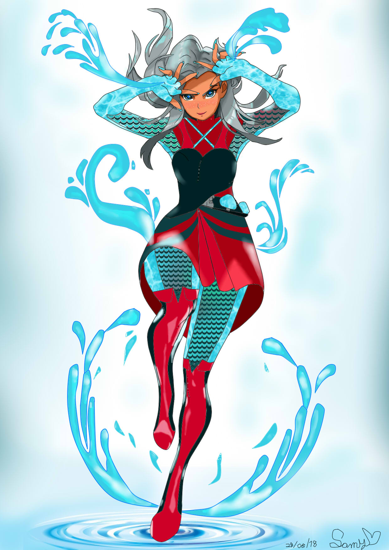 To begin I will talk about the suit, the main idea of the sketch was that since she can manipulate the water but not create it or take it out of nowhere, it occurred to me to make the water be in her suit from some valves hidden in all her suit, so that So when she wanted to, she could get the water through her gloves and get a better control of it. I also put a belt with small water pumps with the same purpose of the valves. I wanted a sporty design and at the same time elegant, I also wanted to make an allusion to the style of the sirens without looking like one, and in the end I loved the result , the combination of colors and the character that she shows in just this little illustration, I hope you like it.