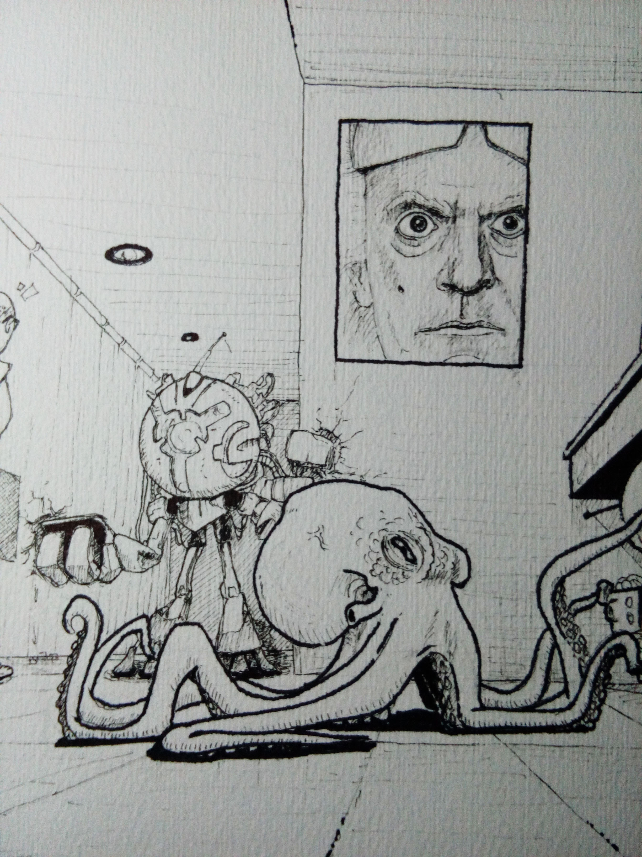 Travelers in Time – Ink on paper. Check out the post for the actual picture, since I chose to feature a cropped section of it :) It’s a cool show of @shimozurdo’s traditional piece, and one that highlights his compositional skills. I love how he inks, and I love that the Doc’s likeness from Back to the Future is immediately recognizable :D