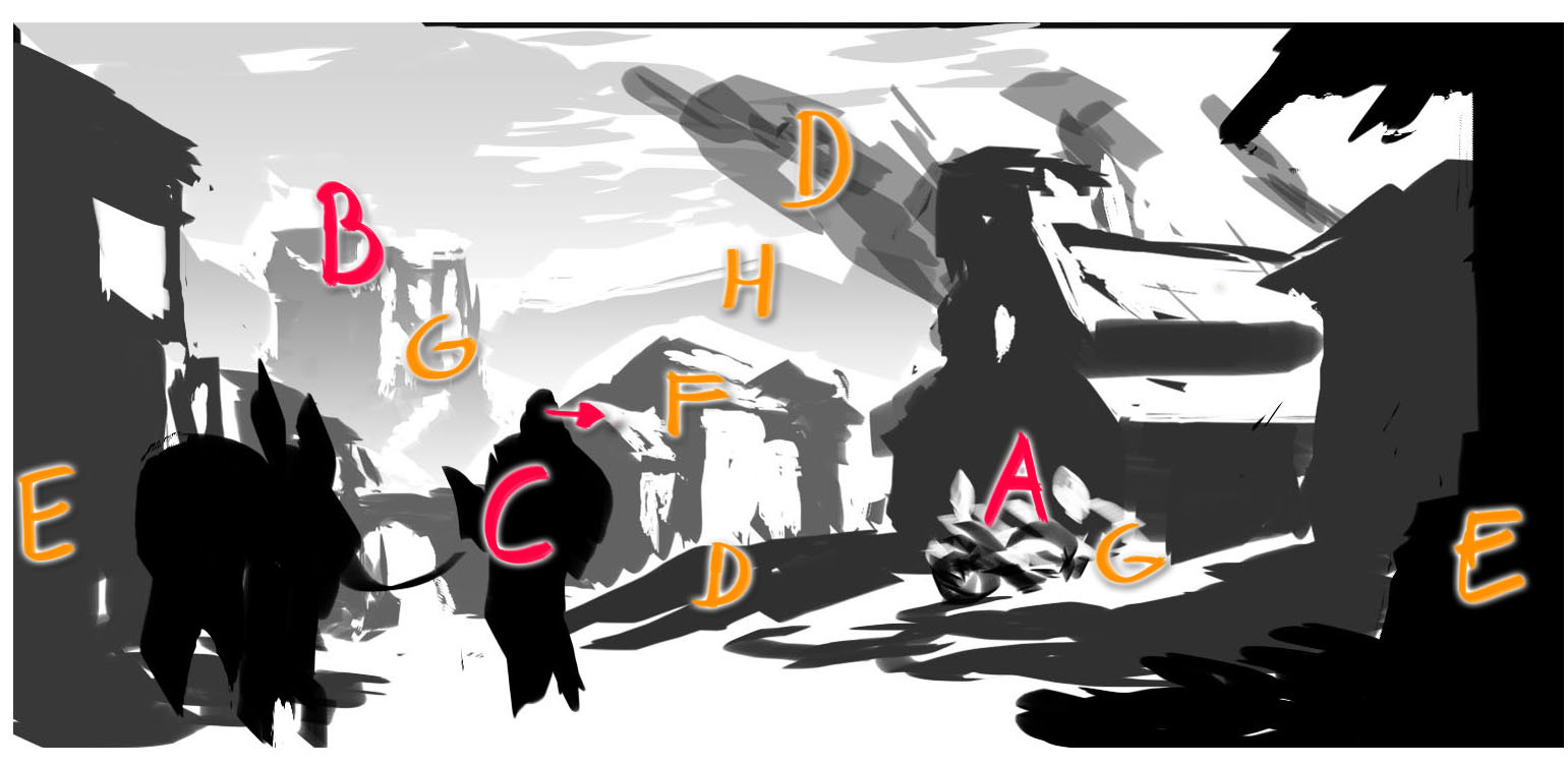The compositional elements in this sketch are:A Villagers fighting the plague. This is the major focus point of the image, since it sets the tone for the whole setting. The villagers are set against the looming silhouette of the church, which creates a nice dark backdrop for the bright shrouds of the plague victims in the morning sun and also is a good metaphorical element for the grim and oppressive authority of the catholic church in medieval times.B The castle as second focus point, a bit removed from the despair in the village but still close enough to signify the nobility’s firm grasp to power. With the eye of the beholder coming in from the top left, moving to the bottom right, it is a natural movement form secondary to primary focus point.C The doctor. Since the project would call for a separate detailed concept for this character, I decided to make him not too dominant in the image and place him and his pack mule, as a kind of tertiary focus point, more in the foreground / near mid ground. His gaze direction also leads the eye of the viewer towards the main focus point A.