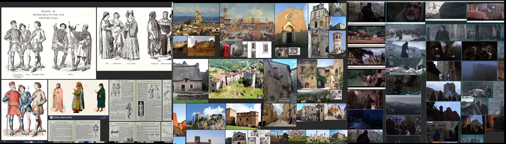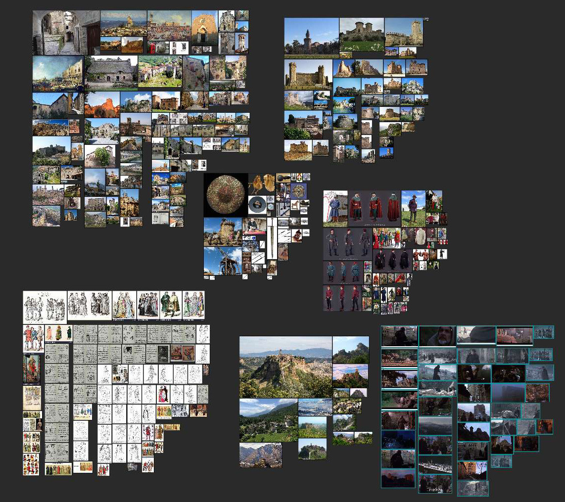 Truly the best thing since sliced bread for this are Google, Wikipedia and the likes. At least to start with. Although it is sometimes hard to chew through some LONG pages of textual facts, and daunting to get a grip on complex topics, it is not negotiable if you have to be accurate on historic facts.I just dig in at promising search results and continue from there, follow key words that pop up, branching off into media searches along the way. That usually includes ebooks, documentaries, sometimes movies and podcasts, and of course lots and lots of images.It is most important though to get the knowledge base right first, because the devil is in the details as always and if you want to avoid mistakes, the flashiest and seemingly obvious image search results are NOT what you need.In this case for example the obvious pitfall was the ‘plague doctor mask’ something that you tend to have in your head instantly, as soon as you hear ‘plague’. Unfortunately, these masks only came up at a later point in history, than the time specified by the client, so if I would have gone after this without proper research, it could have ended in trouble and in the worst case with a poor reputation, which you surely do not want to have ;). When the factual corner stones are established, THEN I head full throttle into the details, i.e. architecture (important for the village and the castle), geography, fashion, every-day life facts of the time, level of technology, customs and social details etc. Of course this can be a quite time consuming process and you have to assess if it is relevant for a project, but in general the more you know about the area in which you are designing, the better!As soon as I am satisfied with the research I tend to compile links to relevant textual facts in my browser and gathered imagery in a reference collection app. I use PureRef these days, because it is fast, free and very powerful. My project reference board would look something like this, with the picture ‘islands’ being the rough categories (from top left to bottom right) architecture, castles, equipment, fashion, fashion historic, landscape and movie screenshots.