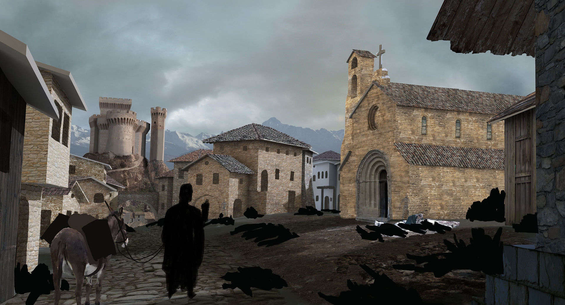 The artwork in question is part of a historical setting, placed in medieval Northern Italy during the time of the bubonic plague, the so called ‘Black Death’. The task at hand was to create a small market village, overlooked and governed by a nobleman’s castle, in which the ominous Black Death wreaks havoc among the desperate population.To this village comes a traveling physician and his arrival at dawn in the central square should be captured with a concept painting.
